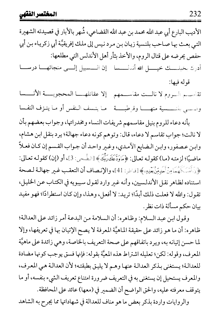 وقول ابن عبد السلام: وظاهرة: أن السلامة من البدعة أمر زائد على العدالة؛ ظاهرة: أن ما هو زائد على حقيقة الماهية المعرفة لا يصح الإتيان بها في تعريفها، وإلا لما حسن إتيانه به، ويرد باتفاقهم على صحة التعريف بالخاصة، وهي زائدة على ماهية المعرف، وقوله: لكن؛ تعليله اشتراط هذه المعية بقوله: فإنها فسق يوجب كونها مضادة للعدالة؛ يستغني بذكر العدالة عنها وهم لا يليق بطبقته؛ لأن العدالة هي المعرف، والمعرف يستحيل أن يستغني به في التعريف ضرورة امتناع تعريف الشيء بنفسه، أو ما يتوقف معرفته عليه، والحق الواضح أن الضمير في (معها) عائد على المحافظة.
