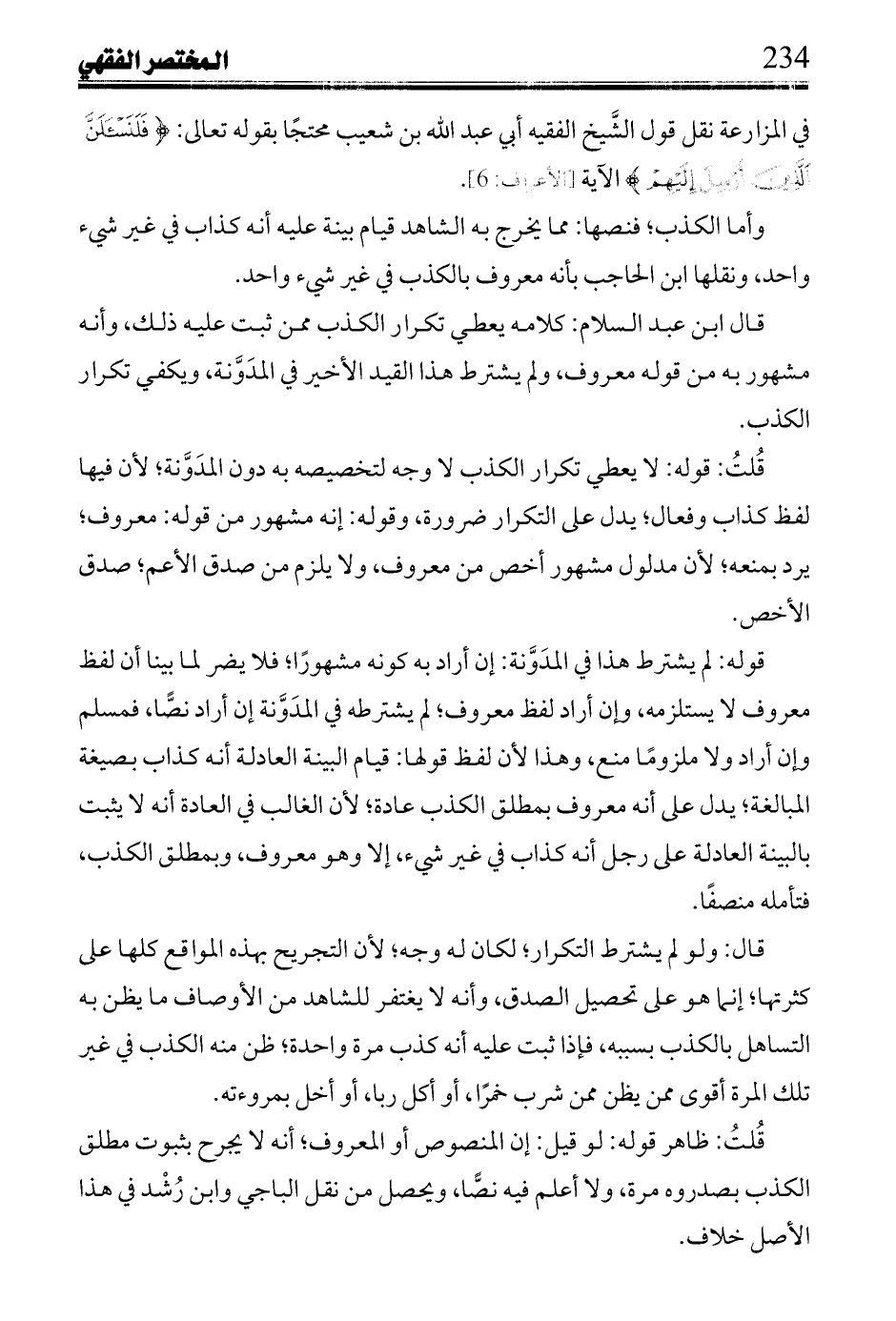 في المزارعة نقل قول الشيخ الفقيه أبي عبد الله بن شعيب محتجاً بقوله تعالي: {فَلَنَسْأَلَنَّ الَّذِينَ أُرْسِلَ إِلَيْهِمْ وَلَنَسْأَلَنَّ الْمُرْسَلِينَ} [الأعراف:6].