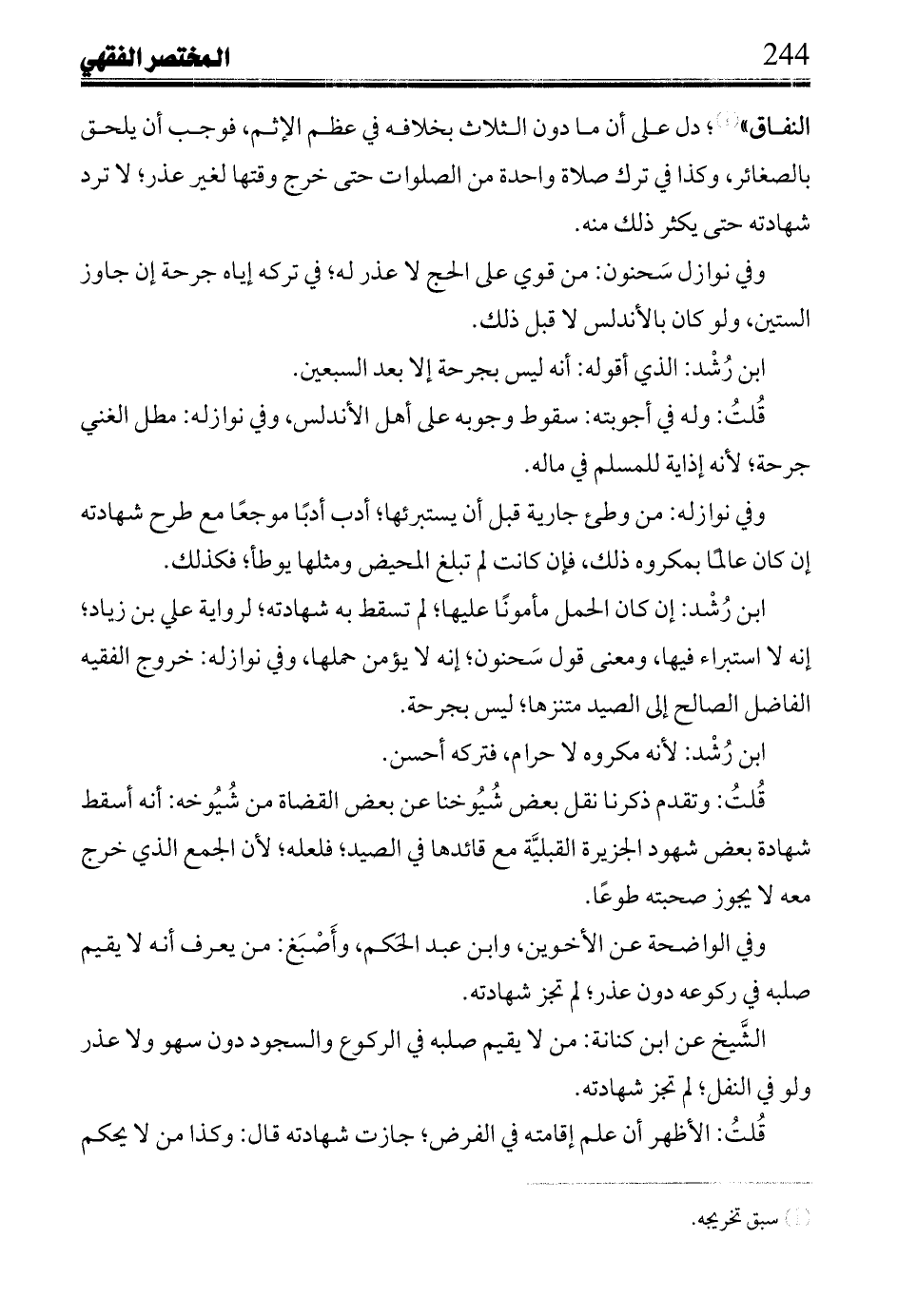 وفي الواضحة عن الأخوين، وابن عبد الحكم، وأصبغ: من يعرف أنه لا يقيم صلبه في رطوعه دون عذر؛ لم تجز شهادته.