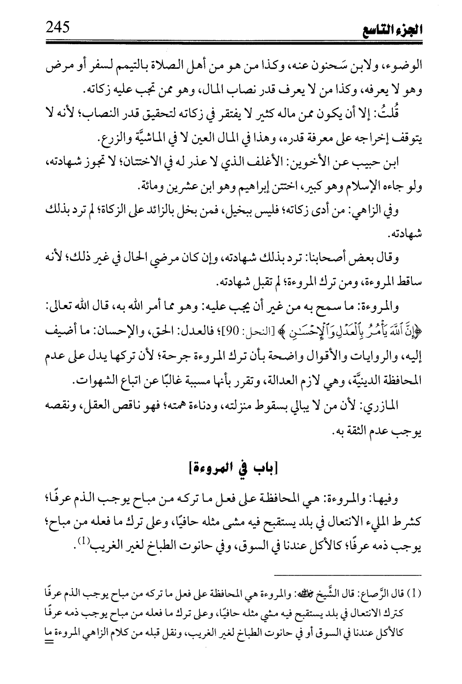 وفيها: والمروءة: هي المحافظة على فعل ما تركه من مباح يوجب الذم عرفاً، كشرط المليء الانتعال في بلد يستقبح فيه مشي مثله حافياً، وعلى ترك ما فعله من مباح؛ يوجب ذمة عرفاً؛ كالأكل عندنا في السوق، وفي حانوت الطباخ لغير الغريب.