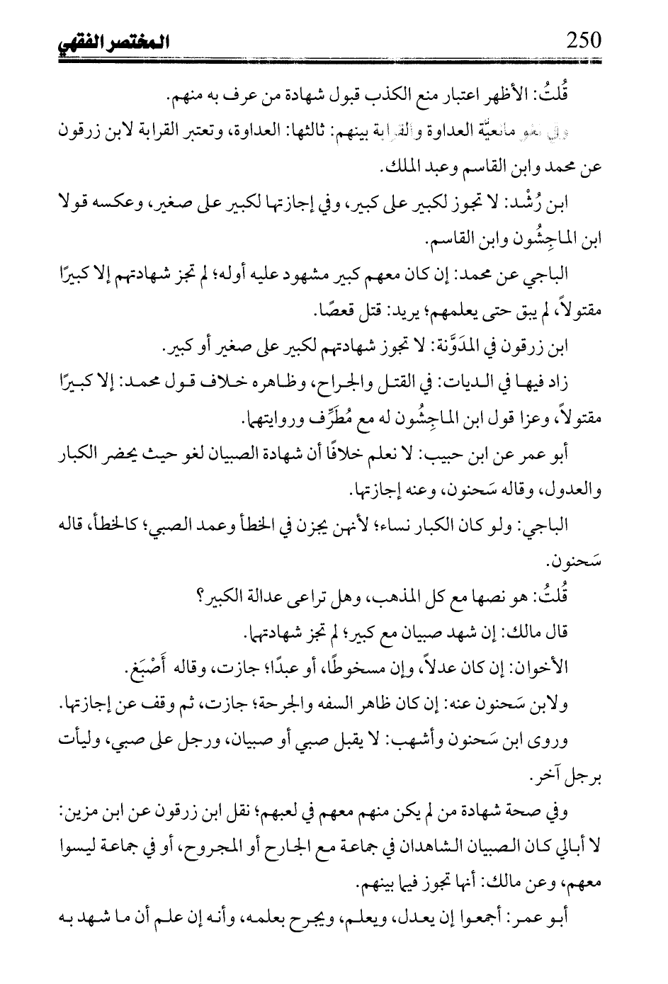 ابن زرقون في المدونة: لا تجوز شهادتهم لكبير على صغير أو كبير.