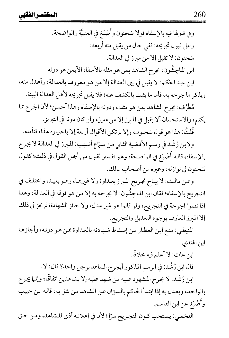 ابن عبد الحَكم: لا يقبل في بين العدالة إلا من هو معروف بالعدالة، وأعدل منه، ويذكر ما جرحه به، فأما ما يلبث بالكشف عنه؛ فلا يقبل تجريحه لأهل العدالة البينة.