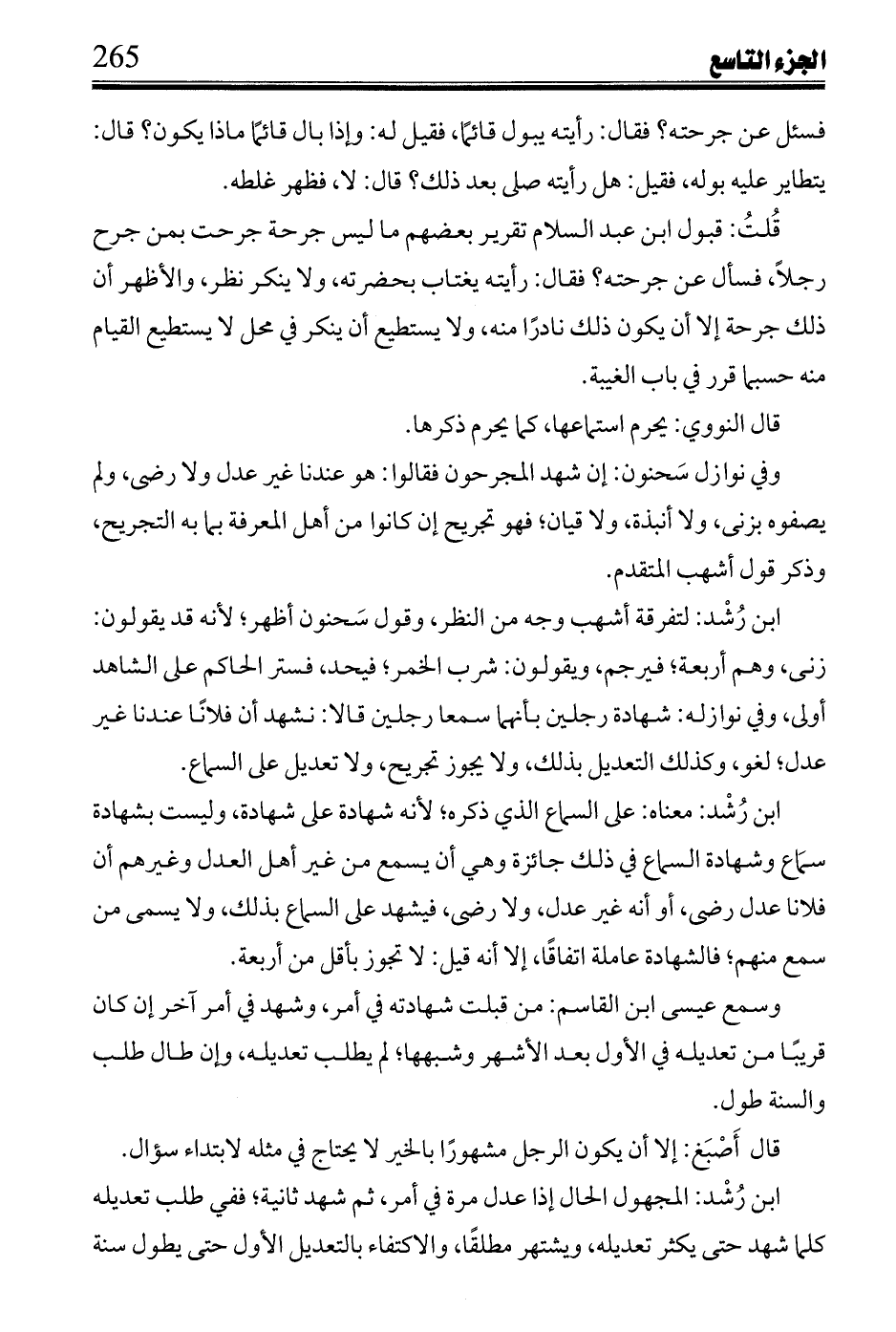 ابن رُشْد: المجهول الحال إذا عدل مرة في أمر، ثم شهد ثانية؛ ففي طلب تعديله كلما شهد حتة يكثر تعديله، ويشتهر مطلقًا، والاكتفاء بالتعديل الأول حتى يطول سنة
