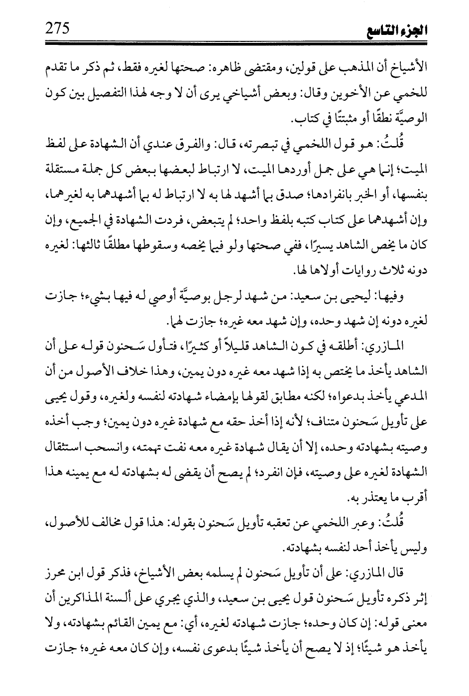 المازرى: أطلقه فى كون الشاهد قليلا أو كثيرا، فتأول سحنون قوله على أن الشاهد يأخذ ما يختص به إذا شهد معه غيره دون يمين، وهذا خلاف الأصول من أن المدعى يأخذ دعواه؛ لكنه مطابق لقولها بإمضاء شهادته لنفسه ولغيره، وقول يحيى على تأويل سحنون متناف؛ لأنه إذا أخذ حقه مع شهادة غيره دون يمين؛ وجب أخذه وصيته بشهادته وحده، إلا أن يقال شهادة غيره معه نفت تهمته، وانسحب استثقال الشهادة لغيره على وصيته، فإن انفرد؛ لم يصح أن يقضى له بشهادته له مع يمينه هذا أقرب ما يعتذر به.
