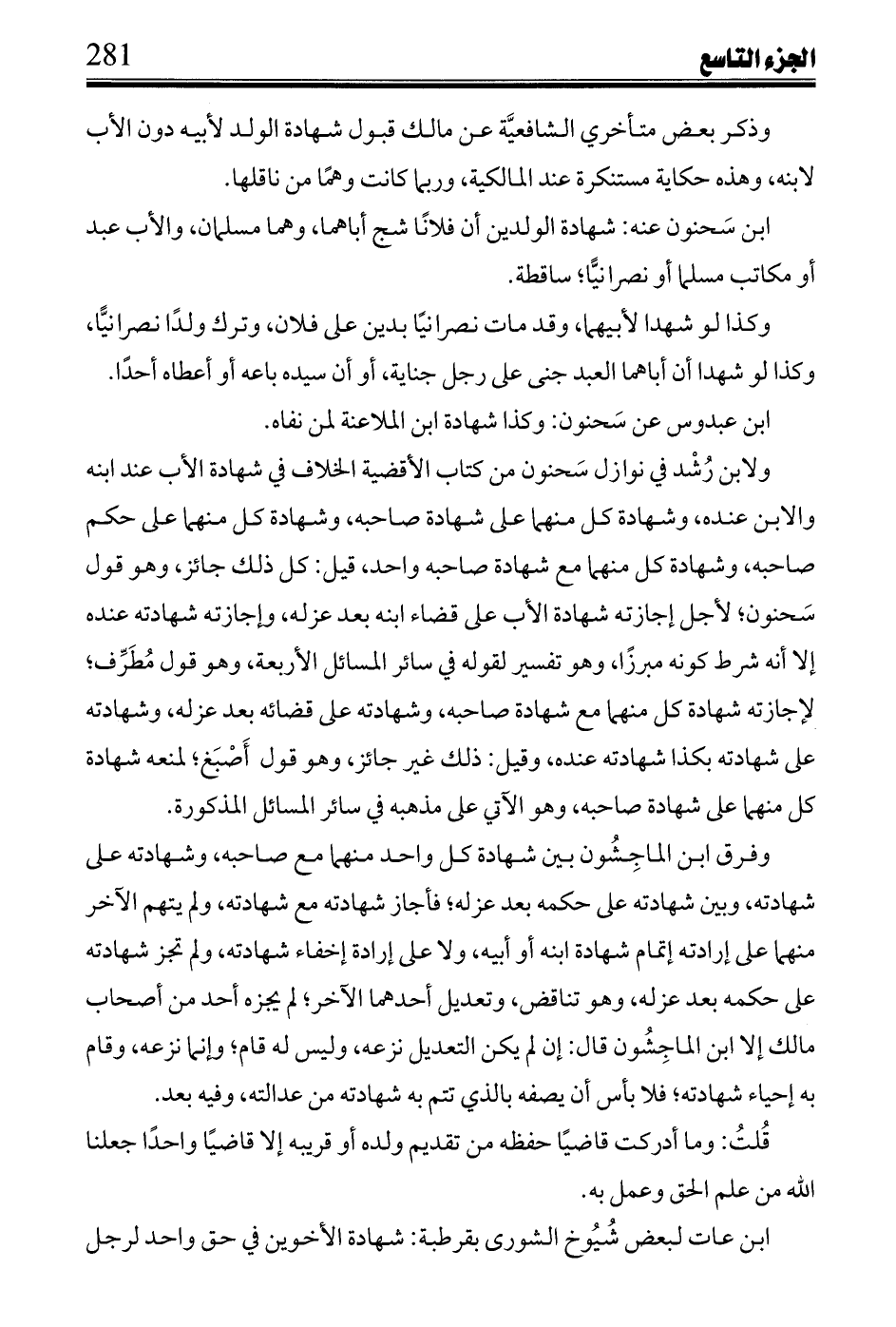 ولابن رُشْد فى نوازل سَحنون من كتاب الأقضية الخلاف فى شهادة الأب عند ابنه والابن عنده، وشهادة كل منهما على شهادة صاحبه، وشهادة كل منهما على حكم صاحبه، وشهادة كل منهما مع شهادة صاحبه واحد، قيل: كل ذلك جائز، وهو قول سَحنون؛ لأجل إجازته شهادة الأب على قضاء ابنه بعد عزله، وإجازته شهادته عنده إلا أنه شرط كونه مبرزًا، وهو تفسير لقوله فى سائر المسائل الأربعة، وهو قول مُطَرَّف؛ لإجازته شهادة كل منهما مع شهادة صاحبه، وشهادته على قضائه بعد عزله، وشهادته على شهادته بكذا شهادته عنده، وقيل: ذلك غير جائز، وهو قول أَصْبَغ؛ لمنعه شهادة كل منهما على شهادة صاحبه، وهو الآتى على مذهبه فى سائر المسائا المذكورة.