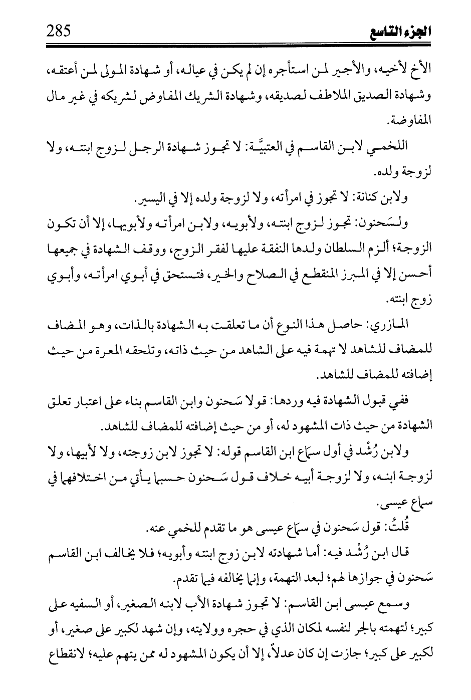 قال ابن رشد فيه: أما شهادته لابن وزج ابنته وأبويه؛ فلا يخالف ابن القاسم سحنون فى جوازهما لهم؛ لبعد التهمة، وإنما يخالفه فيما تقدم.