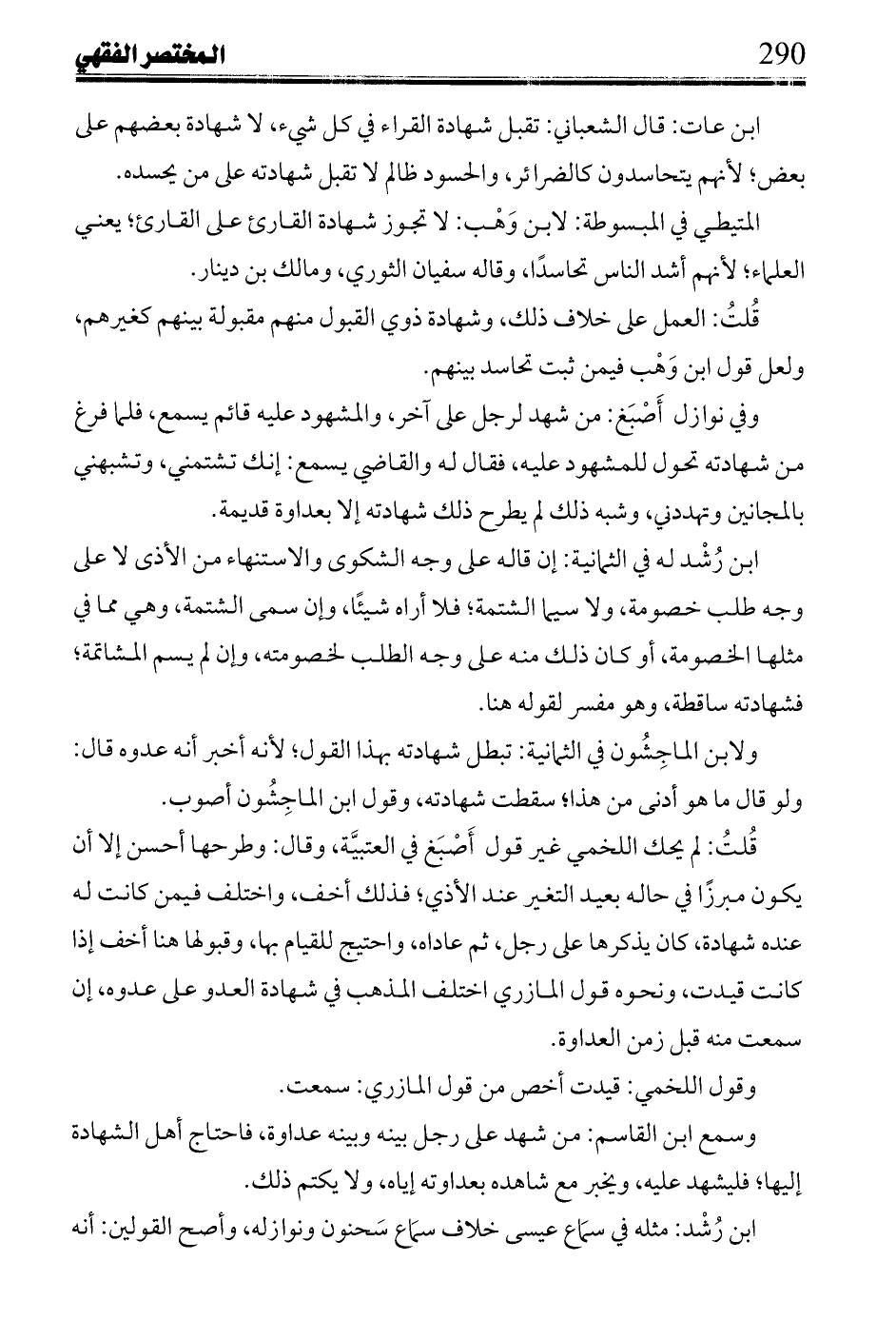 ابن عات: قال الشعباني: تقبل شهادة القراء فى كل شئ، لا شهادة بعضهم على بعض؛ لأنهم يتحاسدون كالضرائر، والحسود ظالم لا تقبل شهادته على من يحسده.