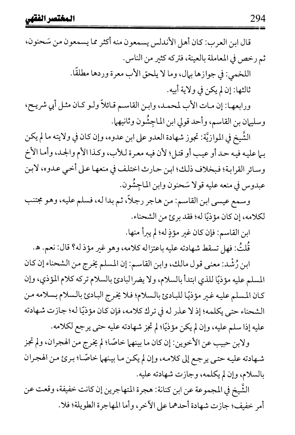 ابن رشد: معنى قول مالك، وابن القاسم: إن المسلم يخرج من الشحناء إن كان المسلم عليه مؤذيا للذى ابتدأ بالسلام، ولا يضر البادئ بالسلام تركه كلام المؤذى، وإن كان المسلم عليه غير مؤذيا للبادئ بالسلام؛ فلا يخرج البادئ بالسلام بسلامه من الشحناء حتى يكلمه؛ إذ لا عذر له فى ترك كلامه، فإن كان مؤذيا له؛ جازت شهادته عليه إذا سلم عليه، وإن لم يكن مؤذيا؛ لم تجز شهادته عليه حتى يرجع لكلامه.