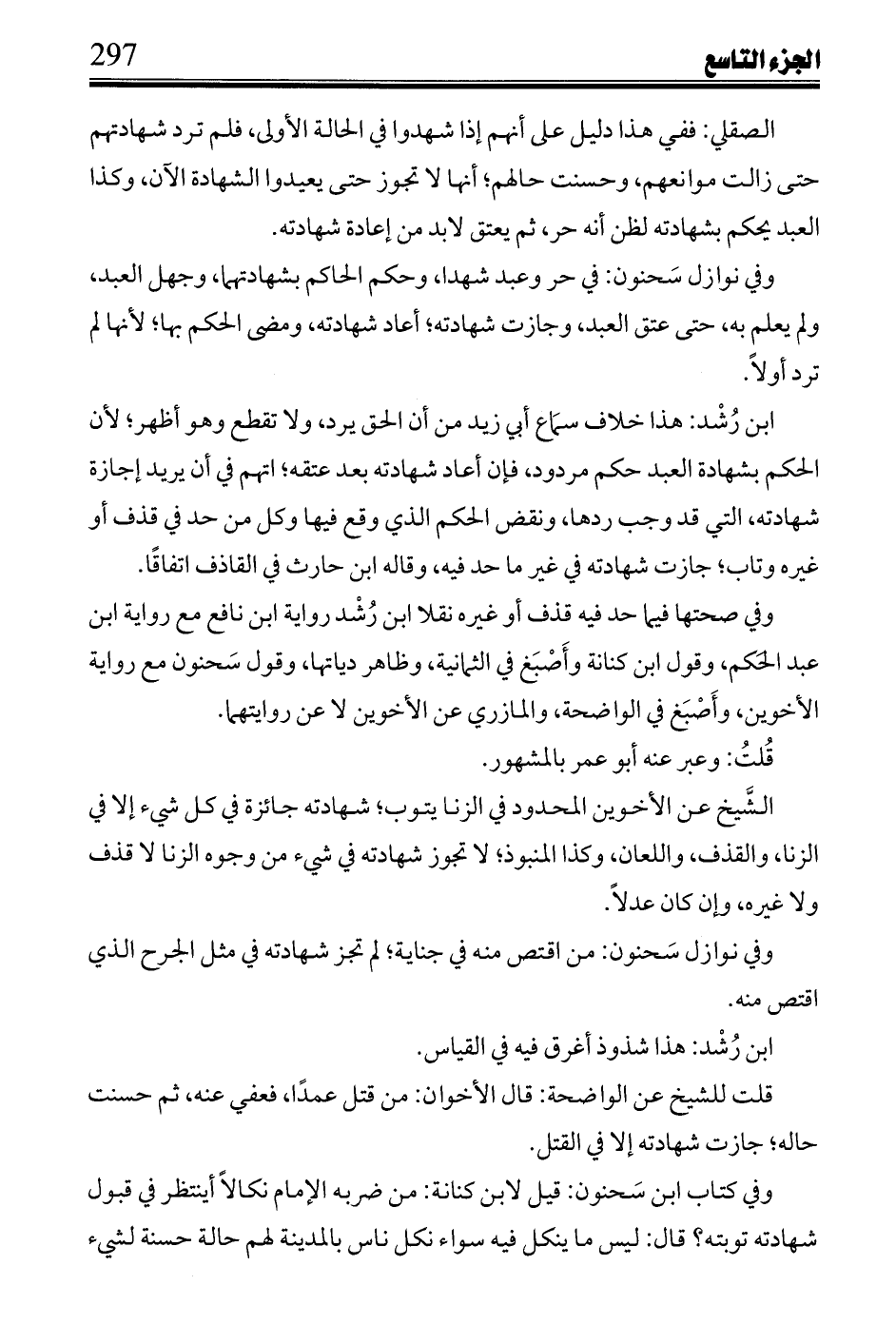 ابن رشد: هذا خلاف سماع أبى زيد من أن الحق يرد، ولا تقطع وهو أظهر؛ لأن الحكم بشهادة العبد خكم مردود، فإن أعاد شهادته بعد عتقه؛ اتهم فى أن يريد إجازة شهادته، التى قد وجب ردها، ونقض الحكم الذى وقع فيها وكل من حد فى قذف أو غيره وتاب؛ جازت شهادته فى غير ما حد فيه، وقاله ابن حارث فى القاذف اتفاقا.