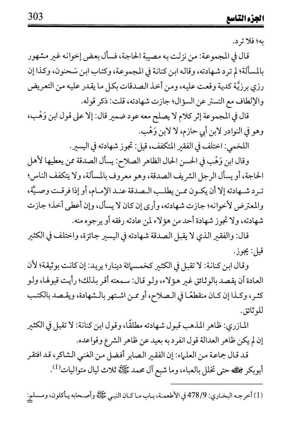 قال: والفقير الذي لا يقبل الصدقة شهادته في اليسير جائزة، واختلف في الكثير قيل: يجوز.