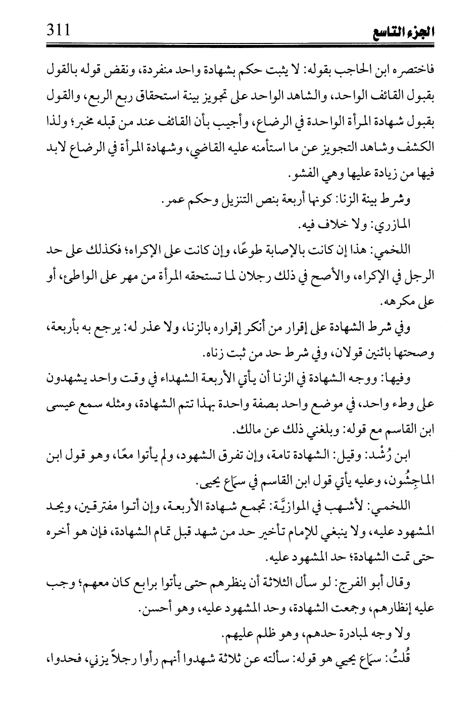 وفيها: ووجه الشهادة في الزنا أن يأتي الأربعة الشهداء في وقت واحد يشهدون على وطء واحد، في موضع واحد بصفة واحدة بهذا تتم الشهادة، ومثله سمع عيسي، ابن القاسم مع قوله: وبلغني ذلك عن مال.