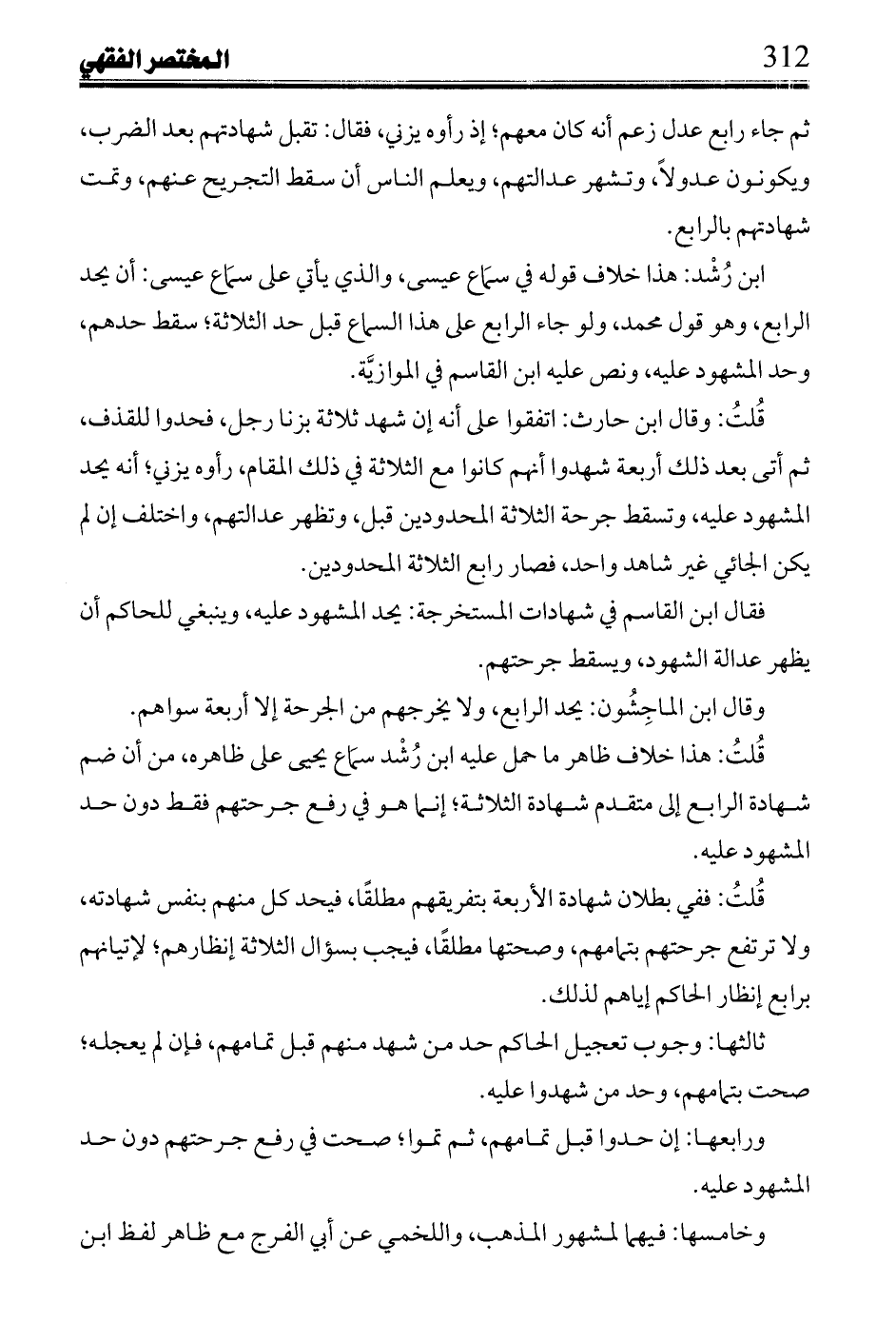 قلت: وقال ابن حارث: اتفقوا على أنه إن شهد ثلاثة بزنا رجل، فحدوا للقذف، ثم أتى ذلك أربعة شهدوا أنهم كانوا مع الثلاثة في ذلك المقام، رأوه يزني؛ أنه يحد المشهود عليه، وتسقط جرحة الثلاثة المحدودين قبل، وتظهر عدالتهم، واختلف إن لم يكن الجائي غير شاهد واحد، فصار رابع الثلاثة المحدودين.