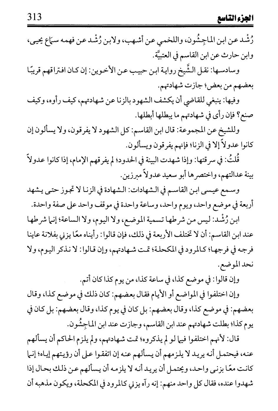 وسمع عيسى ابن القاسم في الشهادات: الشهادة في الزنا لا تجوز حتى يشهد أربعة في موضع واحد، ويوم واحد، وساعة واحدة في موقف واحد على صفة واحدة.