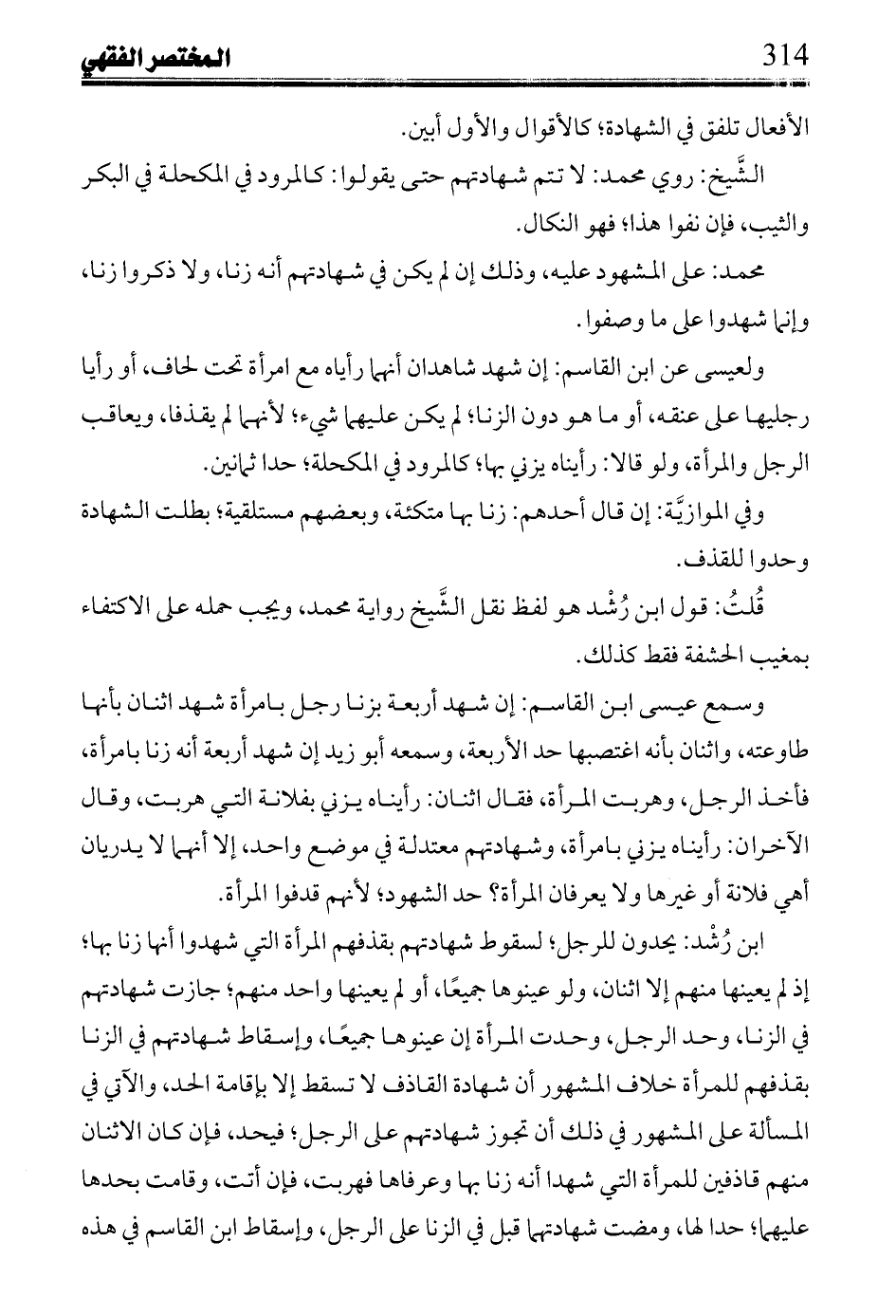 ابن رشد: يحدون للرجل؛ لسقوط شهادتهم بقذفهم المرأة التي شهدوا أنها زنا بها؛ إذ لم يعينها منهم إلا اثنان، ولو عينوها جميعاً، أو لم يعينها واحد منهم، جازت شهادتهم في الزنا، وحد الرجل، وحدت المرأة إن عينوها جميعاً، وإسقاط شهادتهم في الزنا بقذفهم للمرأة خلاف المشهور أن شهادة القاذف لا تسقط إلا بإقامة الحد، والآتي في المسألة على المشهور في ذلك أن تجوز شهادتهم على الرجل؛ فيحد، فإن كان الاثنان منهم قاذفين للمرأة التي شهدا أنه زنا بها وعرفاها فهربت، فإن أتت، وقامت بحدها عليهما؛ حدا لها، ومضت شهادتهما قبل في الزنا على الرجل، وإسقاط ابن القاسم في هذه
