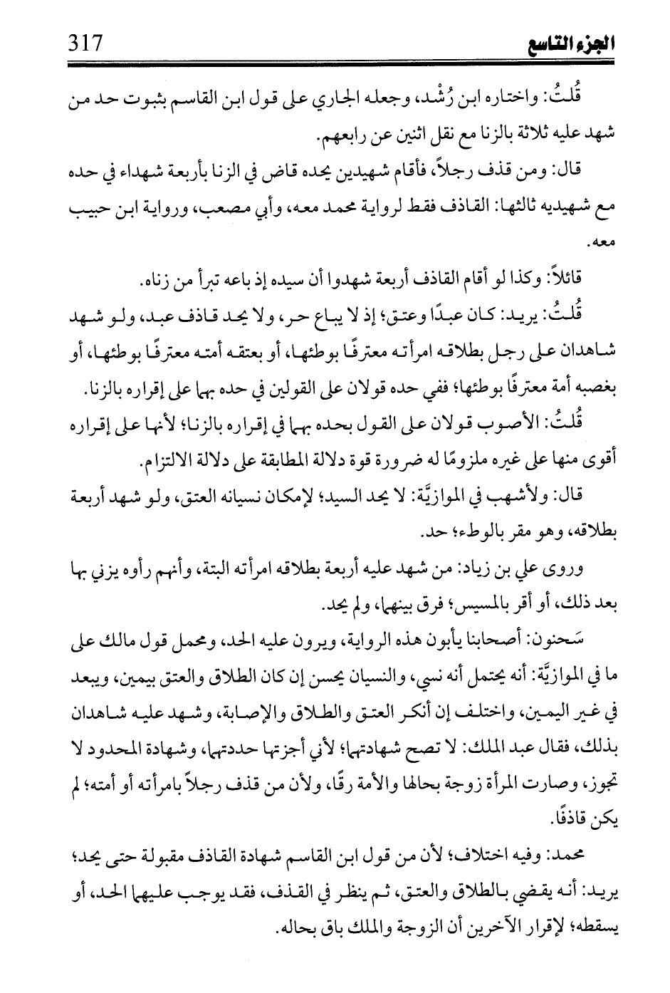 محمد: وفيه اختلاف؛ لأن من قول ابن القاسم شهادة القاذف مقبولة حتى يحد؛ يريد؛ أنه يقضي بالطلاق والعتق، ثم ينظر في القذف، فقد يوجب عليهما الحد، أو يسقطه؛ لإقراره الآخرين أن الزوجة والملك باق بحاله.