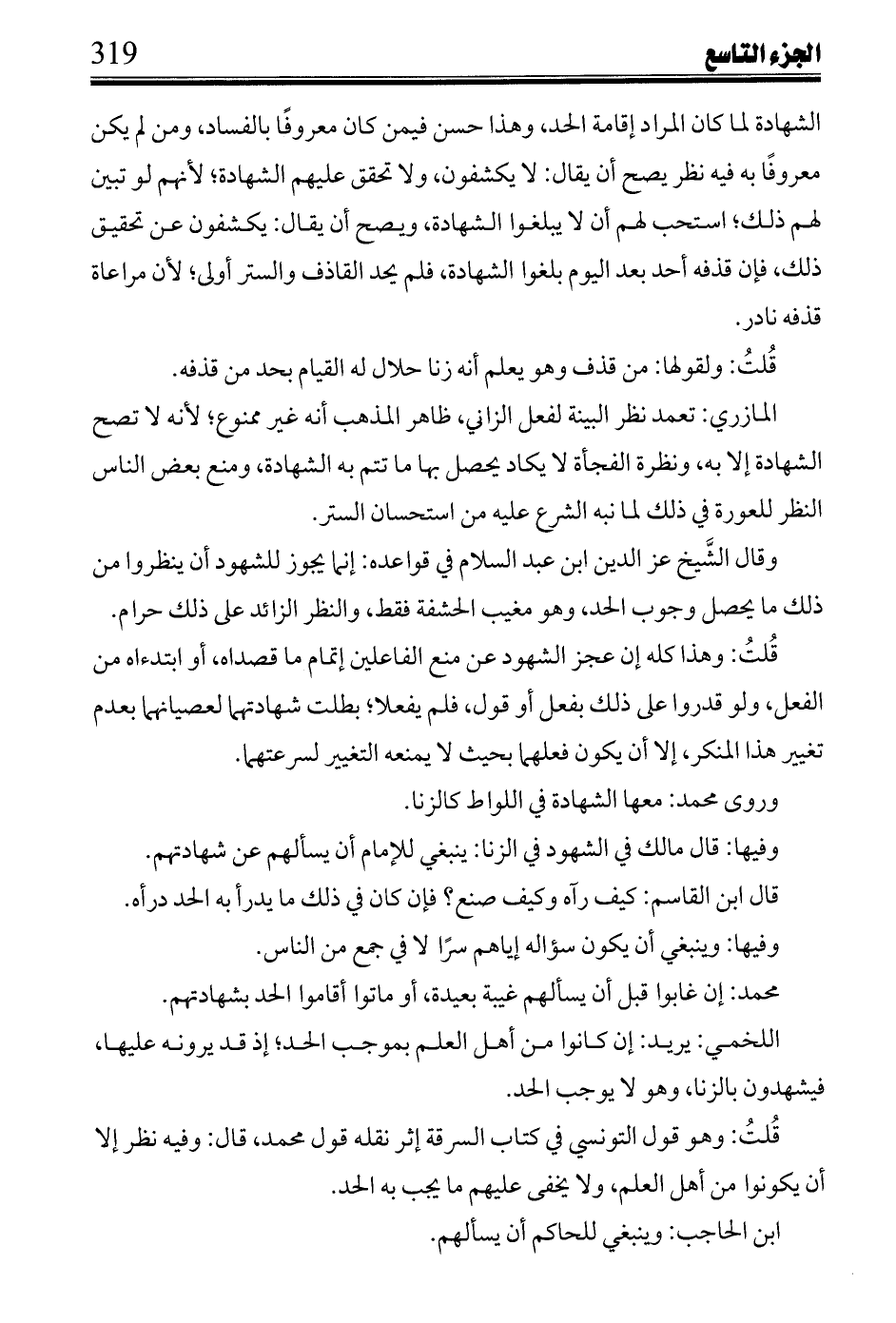 وقال الشيخ عز الدين ابن عبد السلام في قواعده: إنما يجوز للشهود أن يظروا من ذلك ما يحصل وجوب الحد، وهو مغيب الحشفة فقط، والنظر الزائد على ذلك حرام.