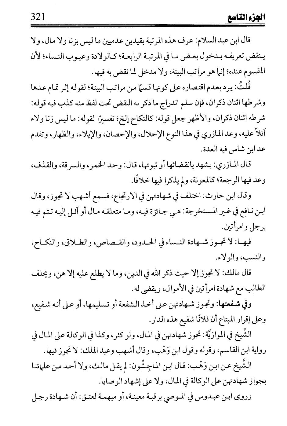 فيها: لا تجوز شهادة النساء في الحدود، والقصاص، والطلاق، والنكاح، والنسب، والولاء.