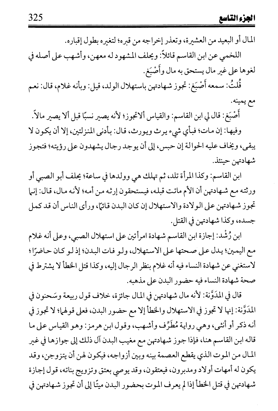 ابن رشد: إجازة ابن القاسم شهادة امرأتين على استهلال الصبي، وعلى أنه غلام مع اليمين؛ يدل على صحتها على الاستهلال، ولو فات البدن؛ إذ لو كان حاضراً؛ لاستغني عن شهادة النساء فيه أنه غلام بنظر الرجال إليه، وكذا قتل الخطأ لا يشترط في صحة شهادة النساء فيه حضور البدن على مذهبه.