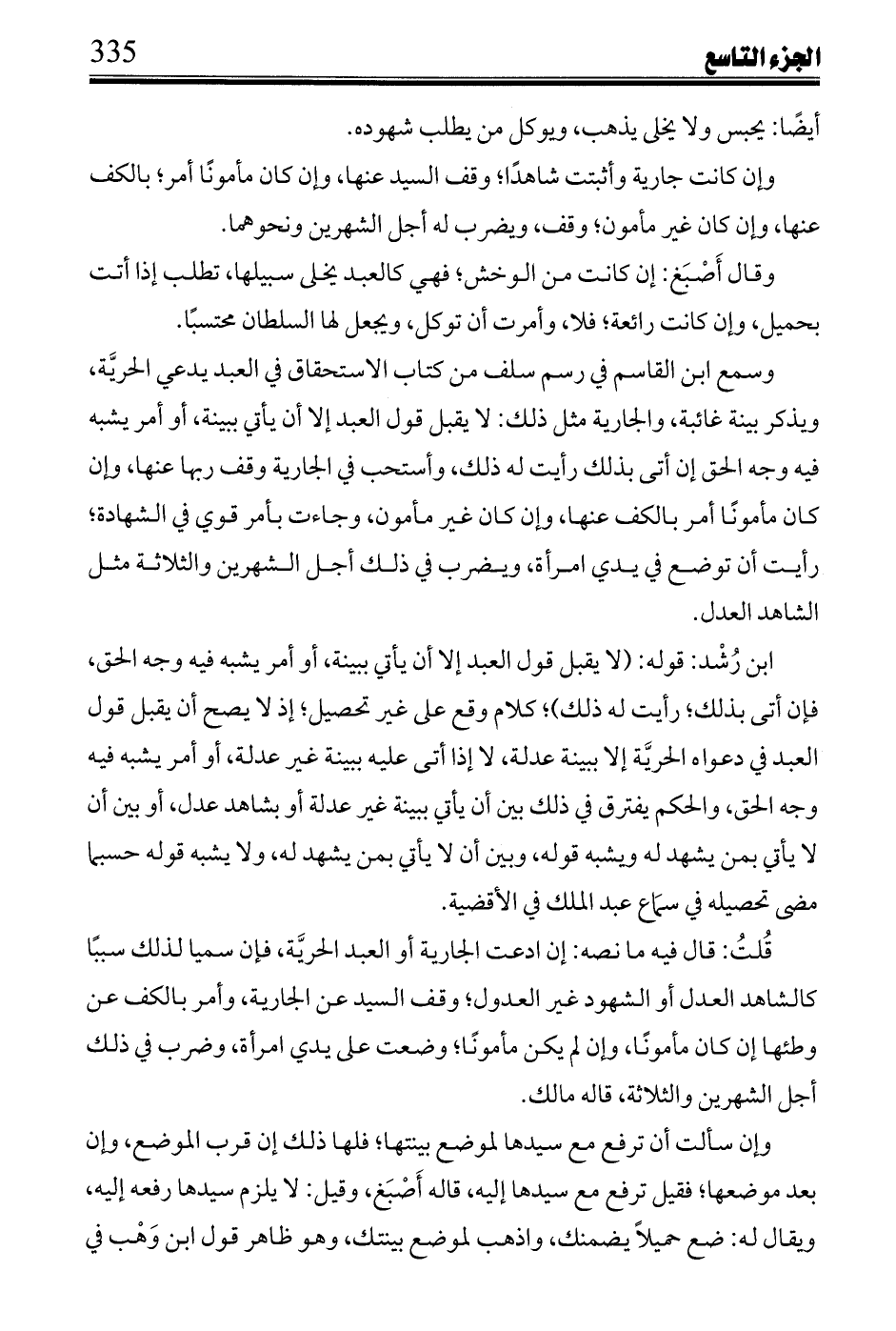 ابن رشد: قوله: (لا يقبل قول العبد إلا أ، يأتي ببينة، أو أمر يشبه فيه وجه الحق، فإن أتى بذلك؛ رأيت له ذلك)؛ كلام وقع على غير تحصيل؛ إذ لا يصح أن يقبل قول العبد في دعواه الحرية إلا ببينة عدلة، لا إذا أتى عليه ببينة غير عدلة، أو أمر يشبه فيه وجه الحق، والحكم يفترق في ذلك بين أن يأتي ببينة غير عدلة أو بشاهد عدل، أ، بين أن لا يأتي بمن يشهد له ويشبه قوله، وبين أن لا يأتي بمن يشهد له، ولا يشبه قوله حسبما مصي تحصيله في سماع عبد الملك في الأقضية.