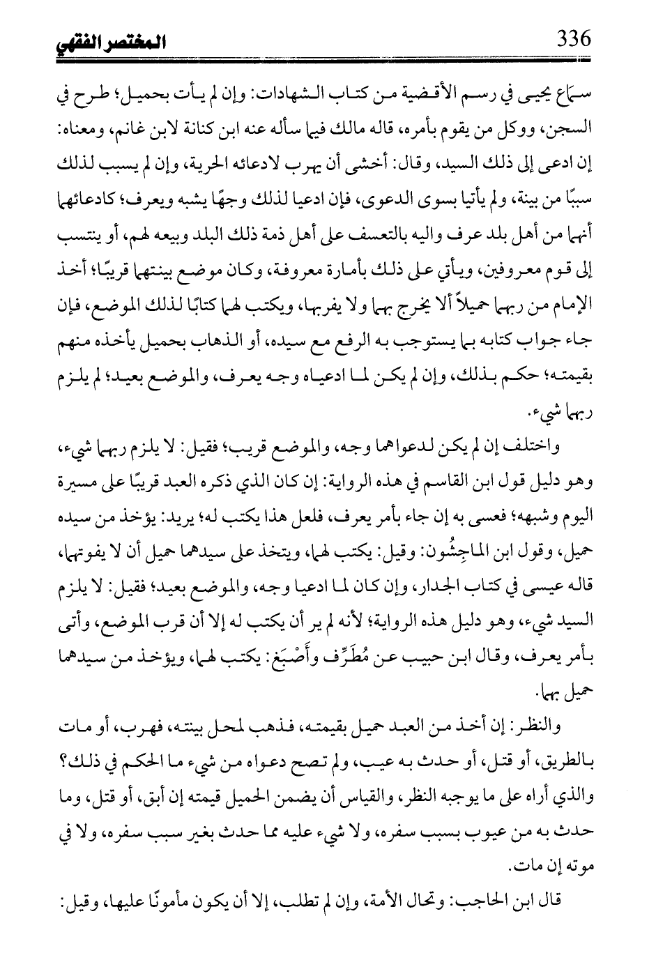سماع يحيى في رسم الأقضية من كتاب الشهادات: وإن لم يأت بحميل؛ طرح في السجن، ووكل من يقوم بأمره، قاله مالك فيما سأله عنه ابن كنانة لابن غانم، ومعناه: إن أدعى إلى ذلك السيد، وقال: أخشى أن يهرب لادعائه الحرية، وإن لم يسبب لذلك سبباً من بينة، ولم يأتيا بسوي الدعوى، فإن ادعيا لذلك وجهاً يشبه ويعرف؛ كادعائهما أنهما من أهل بلد عرف واليه بالتعسف على أهل ذمة ذلك البلد وبيعه لهم، أو ينتسب إلى قوم معروفين، ويأتي على ذلك بأمارة معروفة، وكان موضع بينتها قريباً؛ أخذ الإمام من ربهما حميلاً ألا يخرج بهما ولا يفربها، ويكتب لهما كتاباً لذلك الموضع، فإن جاء جواب كتابه بما يستوجب به الرفع مع سيده، أو الذهاب بحميل يأخذه منهم بقيمته؛ حكم بذلك، وإن لم يكن لما ادعياه وجه يعرف، والموضع بعيد؛ لم يلزم ربهما شيء.
