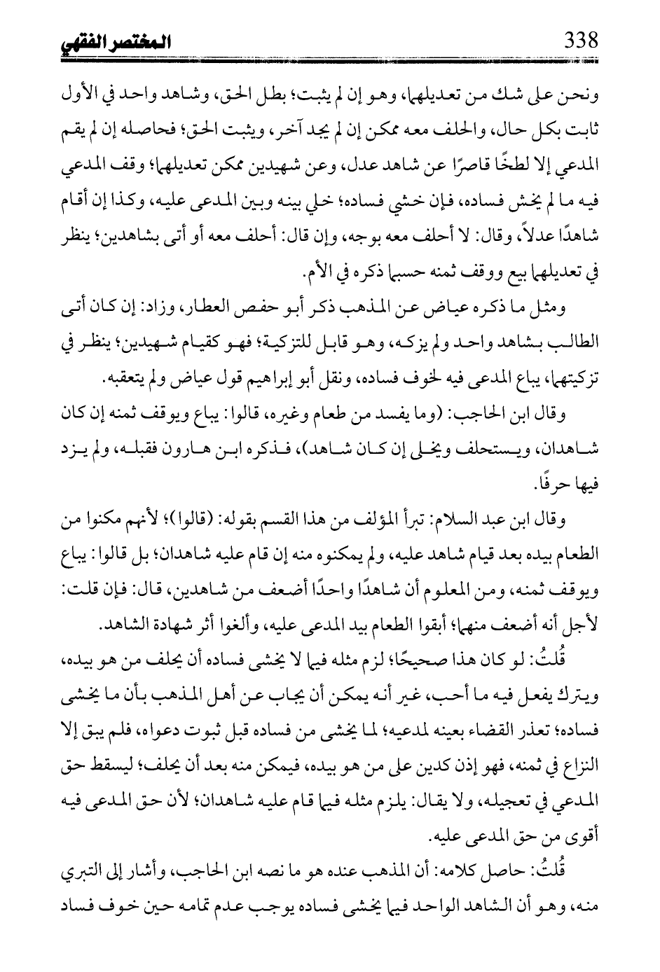 وقال ابن الحاجب: (وما يفسد من طعام وغيره، قالوا: يباع وبوقف ثمنه إن كان شاهدان، ويستحلف ويخلي إن كان شاهد)، ف 1 كره ابن هارون فقبله، ولم يزد فيها حرفاً.