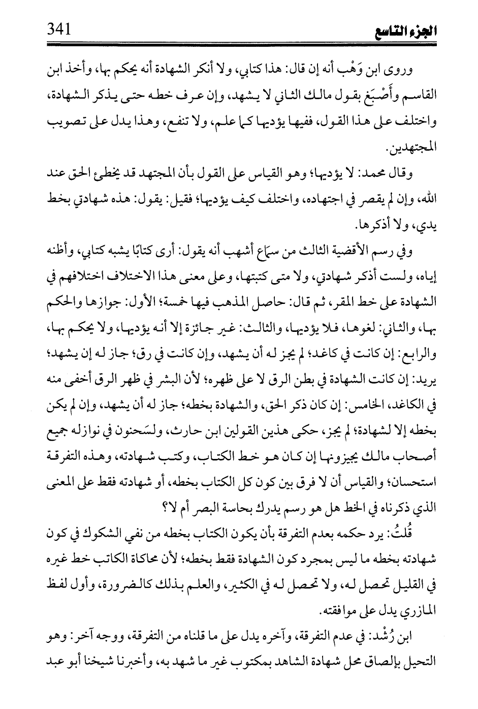 وروى ابن وهب أنه إن قال: هذا كتابي، ولا أنكر الشهادة أنه يحكم بها، وأخذ ابن القاسم وأصبغ بقول مالك الثاني لا يشهد، وإن عرف خطه حتى يذكر الشهادة، واختلف على هذا الفول، ففيها يؤديها كما علم، ولا تنفع، وهذا يدل على تصويب المجتهدين.