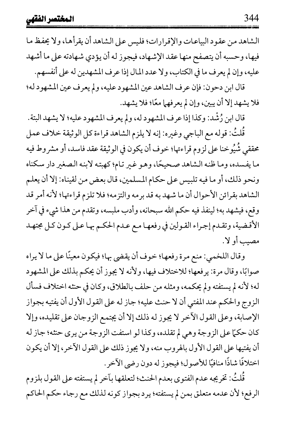 الشاهد من عقود البياعات والإقرارات؛ فليس على الشاهد أن يقرأها، ولا يحفظ ما فيها، وحسبه أن يتصفح منها عقد الإشهاد، فيجوز له أن يؤدي شهادته على ما أشهد عليه، وإن لم يعرف ما في الكتاب، ولا عدد المال إذا عرف المشهدين له على أنفسهم.