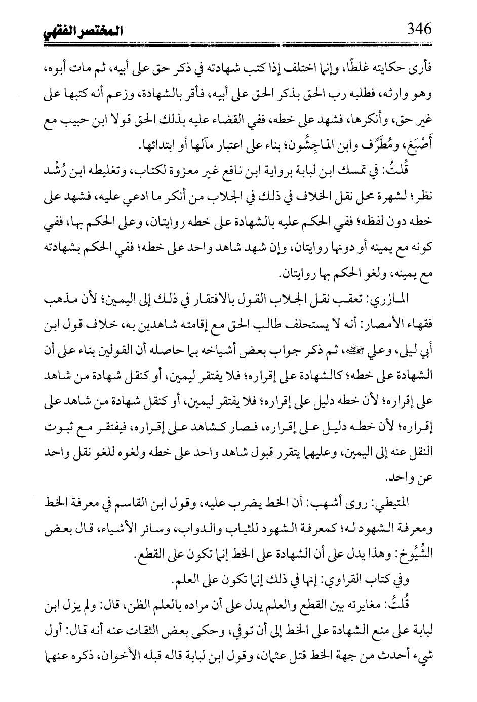 قلت: في تمسك ابن لبابة برواية ابن نافع غير معزوة لكتاب، وتغليطه ابن رشد نظر؛ لشهرة محل نقل الخلاف في ذلك في الجلاب من أنكر ما ادعى عليه، فشهد على خطه دون لفظه؛ ففي الحكم عليه بالشهادة على خطه روايتان، وعلى الحكم بها، ففي كونه مع يمينه أو دونها روايتان، وإن شهد شاهد واحد على خطه؛ ففي الحكم بشهادته مع يمينه، ولغو الحكم بها روايتان.