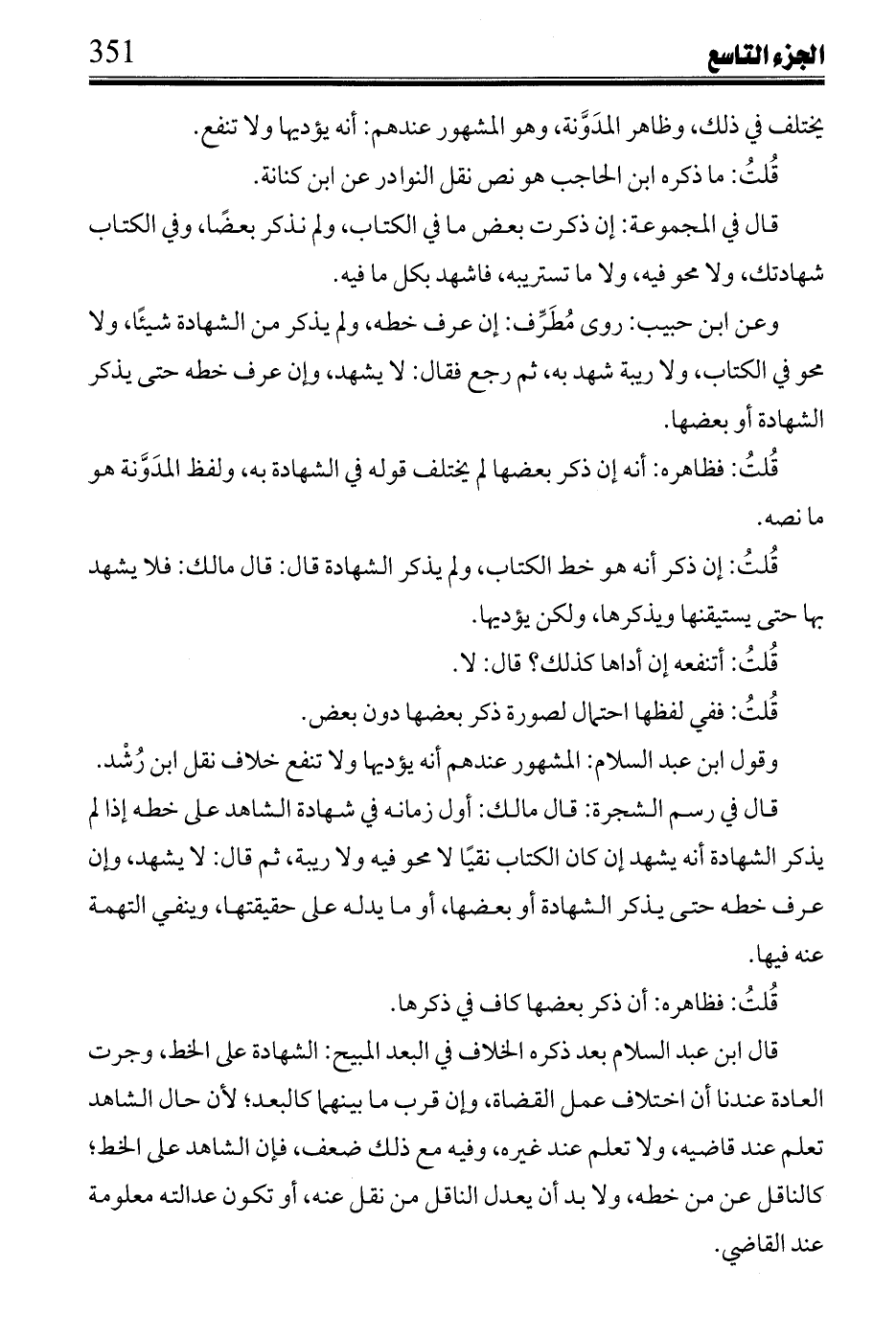وعن ابن حبيب: روى مطرف: إن عرف خطه، ولم يذكر من الشهادة شيئاً، ولا محو في الكتاب، ولا ريبة شهد به، ثم رجع فقال: لا يشهد، وإن عرف خطه حتى يذكر الشهادة أو بعضها.