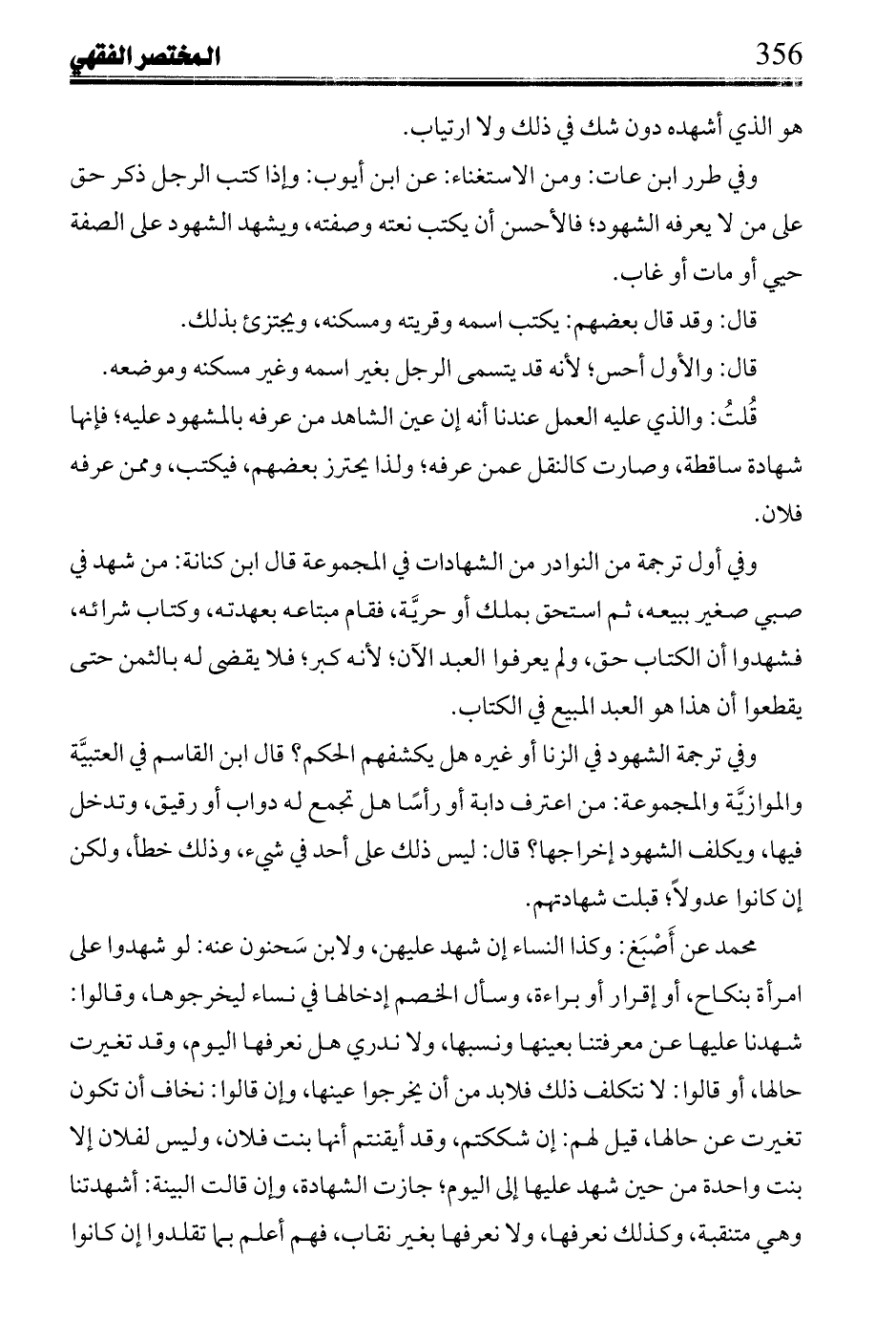 وفي أول ترجمة من النوادر من الشهادات في المجموعة قال ابن كنانة: من شهد في صبي صغير يبيعه، ثم استحق بملك أو حرية، فقام مبتاعه بعهدته، وكتاب شرائه، فشهدوا أن الكتاب حق، ولم يعرفوا العبد الآن؛ لأنه كبر؛ فلا يقضي له بالثمن حتى يقطعوا أن هذا هو العبد المبيع في الكتاب.