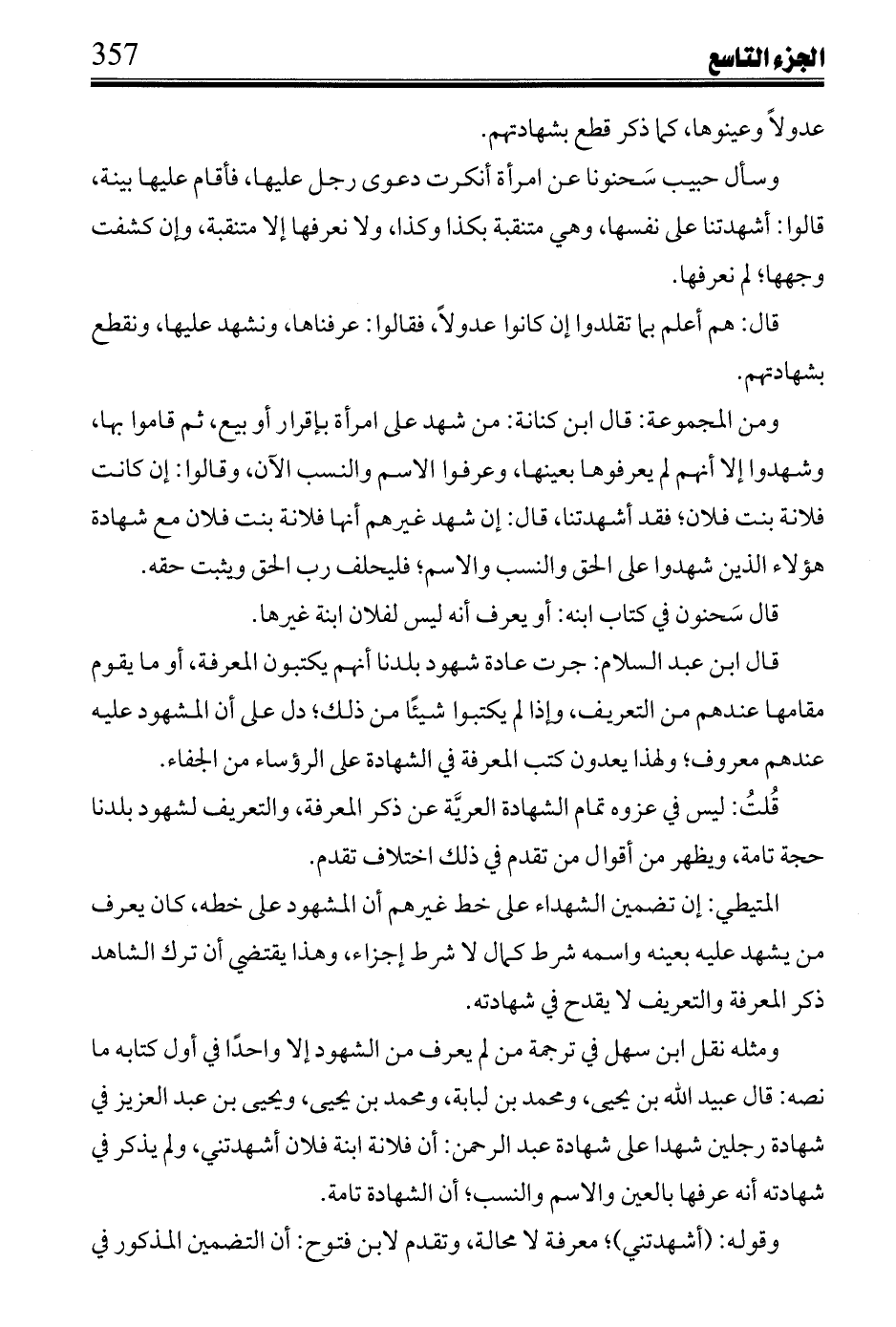 ومثله نقل ابن سهل في ترجمة من لم يعرف من الشهود إلا واحداً في أول كتابه ما نصه: قال عبيد الله بن يحيى، ومحمد لبابة، ومحمد بن يحيى، ويحيى بن عبد العزيز في شهادة رجلين شهداء على شهادة عبد الرحمن: أن فلانة ابنة فلان أشهدتني، ولم يذكر في شهادته أنه عرفها بالعين والاسم والنسب؛ أن الشهادة تامة.