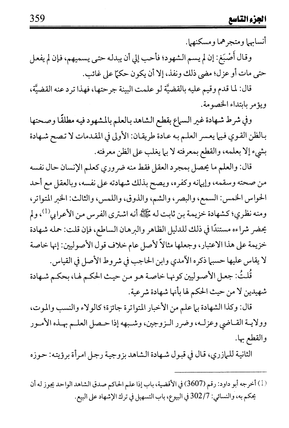 قال: العلم ما يحصل بمجرد العقل فقط منه ضروري كعلم الإنسان حال نفسه من صحته وسقمه، وإيمانه وكفره، ويصبح بذلك شهادته على نفسه، وبالعقل مع أحد الحواس الخمس: السمع، والبصر، والشم، والذوق، واللمس، والثالث: الخبر المتواتر، ومنه نظري؛ كشهادة خزيمة بن ثابت له صلى الله عليه وسلم أنه اشترى الفرس من الأعرابي، ولم يحضر شراءه مستنداً في ذلك للدليل الظاهر والبرهان الساطع، فإن قلت: حمله شهادة خزيمة على هذا الاعتبار، وجعلها مثالا لأصل عام خلاف قول الأصوليين: إنها خاصة لا يقاس عليها حسبها ذكر الآمدي وابن الحاجب في شروط الأصل في القياس.