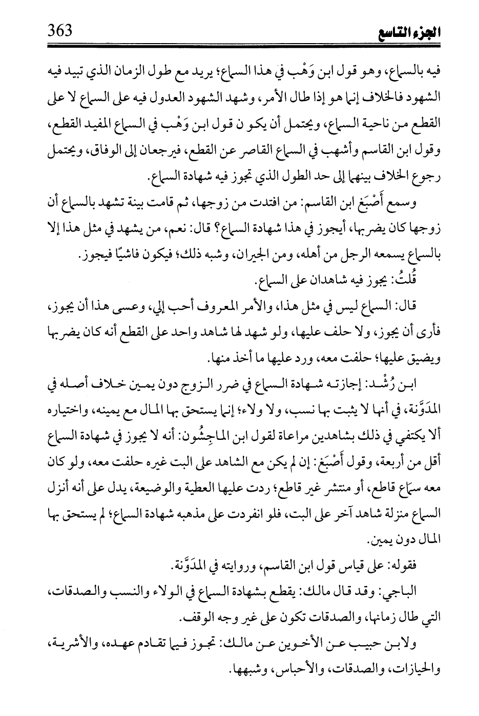 ابن رشد: إجازته شهادة السماع في ضرر الزوج دون يمين خلاف أصله في المدونة، في أنها لا يثبت بها نسب، ولا ولاء؛ إنها يستحق بها المال مع يمينه، واختياره ألا يكتفي في ذلك بشاهدين مراعاة لقول ابن الماجشون: أنه لا يجوز في شهادة السماع أقل من أربعة، وقول أصبغ: إن لم يكن مع الشاهد على البنت غيره حلفت معه، ولو كان معه سماع أو منتشر غير قاطع؛ ردت عليها العطية والوضيعة، يدل على أنه انزل السماع منزلة شاهد آخر على البت، فلو انفردت على مذهبه شهادة السماع؛ لم يستحق بها المال دون يمين.