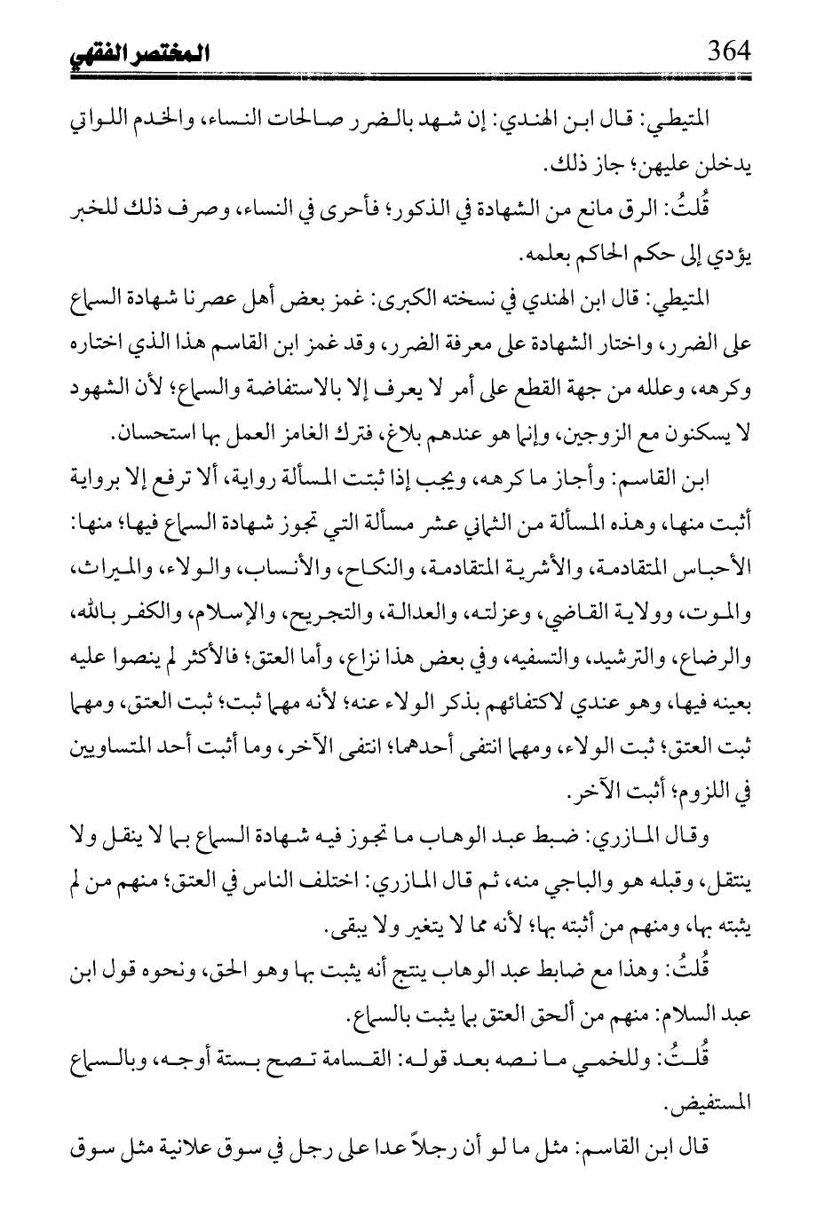 ابن القاسم: وأجاز ما كرهه، ويجب إذا ثبتت المسألة رواية، إلا ترفع إلا برواية اثبت منها، وهذه المسألة من الثماني عشر مسألة التي تجوز شهادة السماع فيها؛ منها: الأحباس المتقادمة، والنكاح، والأنساب، والولاء، والميراث، والموت، وولاية القاضي، وعزلته، والعدالة، والتجريح، والإسلام، والكفر بالله، والرضاع، والترشيد، والتسفيه، وفي بعض هذا نزاع، وأما العتق؛ فالأكثر لم ينصوا عليه بعينه فيها، وهو عندي لاكتفائهم بذكر الولاء عنه: لأنه مهما ثبت؛ ثبت العتق، ومهما ثبت العتق؛ ثبت الولاء، ومها انتفى أحدهما؛ انتفى الآخر، وما اثبت أحد المتساويين في اللزوم؛ أثبت الآخر.