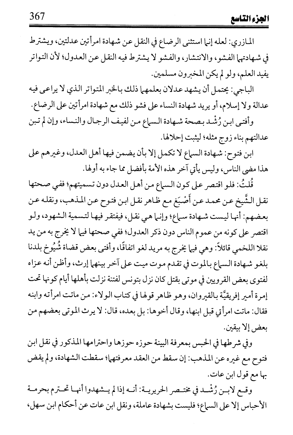 المازري: لعله إنما استثنى الرضاع في النقل عن شهادة امرأتين عدلتين، ويشترط في شهادتهما الفشو، والانتشار، والفشو لا يشترط فيه النقل عن العدول؛ لأن التواتر يفيد العلم، ولو لم يكن المخبرون مسلمين.