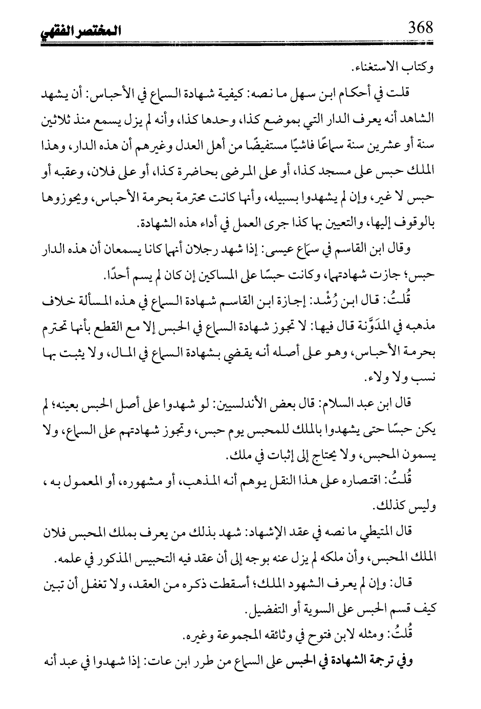 قلت في أحكام ابن سهل ما نصه: كيفية شهادة السماع في الأحباس: أن يشهد الشاهد أنه يعرف الدار التي بموضع كذا، وحدها كذا، وأنه لم يزل يسمع منذ ثلاثين سنة أو عشرين سنة سماعاً فاشياً مستفيضاً من أهل العدل وغيرهم أن هذه الدار، وهذا الملك حبس على مسجد كذا، أو على المرضى بحاضرة كذا، أو على فلان، وعقبة أو حبس لا غير، وإن لم يشهدوا بسبيله، وأنها كانت محترمة بحرمة الأحباس، ويحوزوها بالوقوف إليها، والتعيين بها كذا جرى العمل في أداء هذه الشهادة.