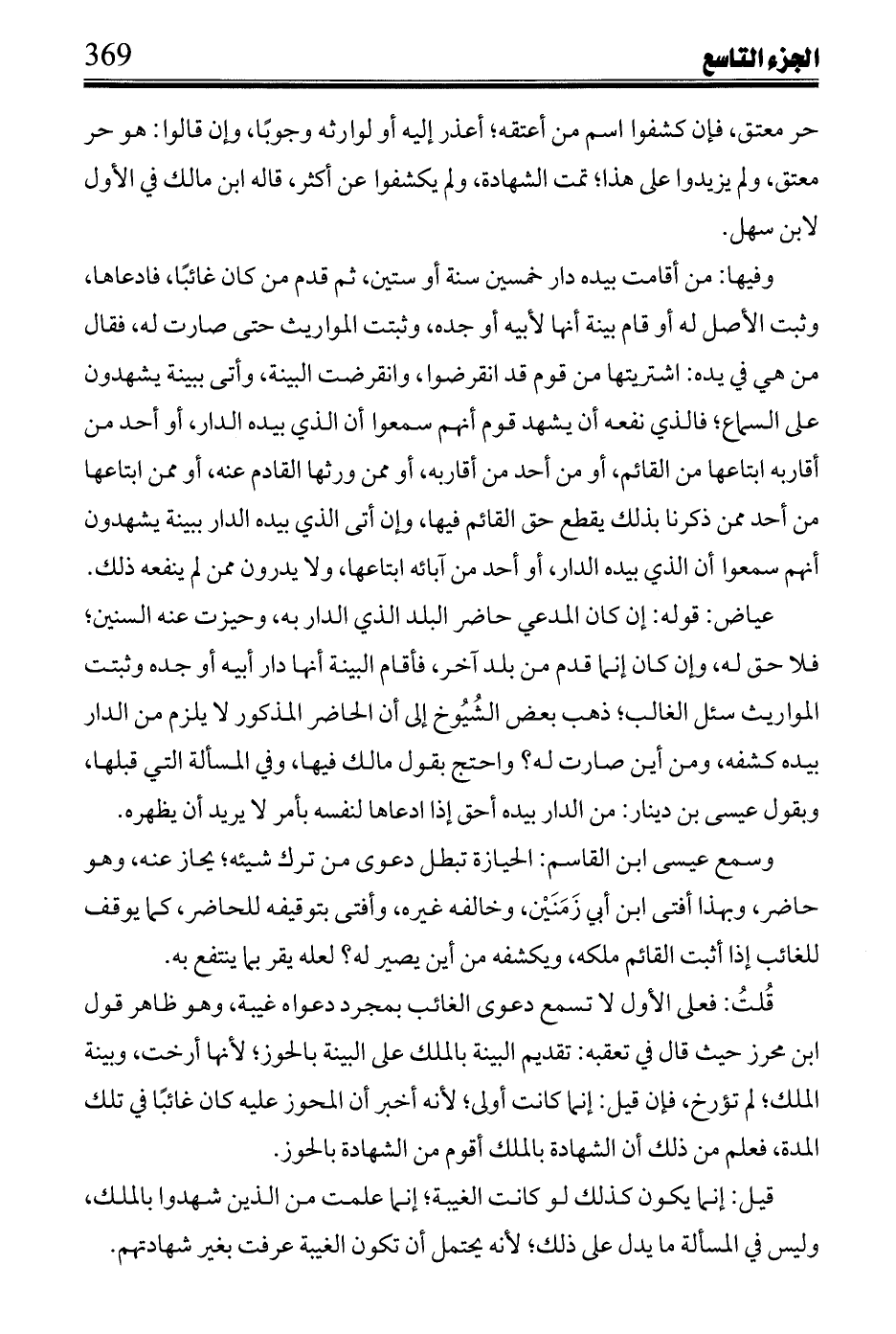 عياض: قوله: إن كان المدعى حاضر البلد الذي الدار به، وحيزت عنه السنين؛ فلا حق له، وإن كان إنما قدم من بلد آخر، فأقام البينة أنها دار أبيه أو وجده وثبتت المواريث سئل الغائب؛ ذهب بعض الشيوخ إلى أن الحاضر المذكور لا يلزم من الدار بيده كشفه، ومن أين صارت له؟ واحتج بقول مالك فيها، وفي المسألة التي قبلها، وبقول عيسى بن دينار: من الدار بيده أحق إذا ادعاها لنفسه بأمر لا يريد أن يظهره.