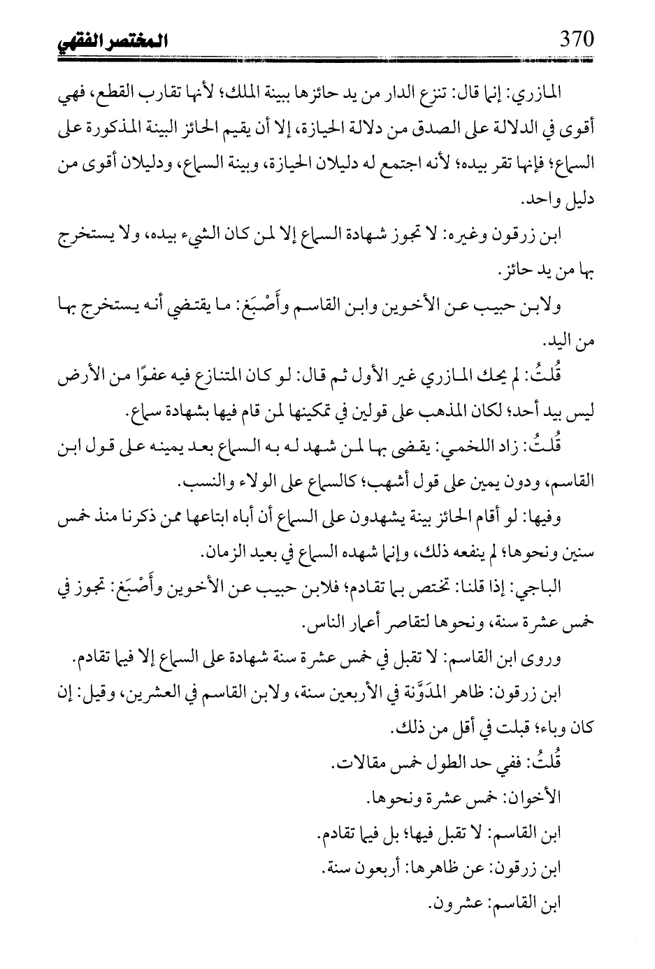 قلت: لم يحك المازري غير الأول ثم قال: لو كانت المتنازع فيه عفواً من الأرض ليس بيد أحد؛ لكان المذهب على قولين في تمكينها لمن قال بشهادة سماع.