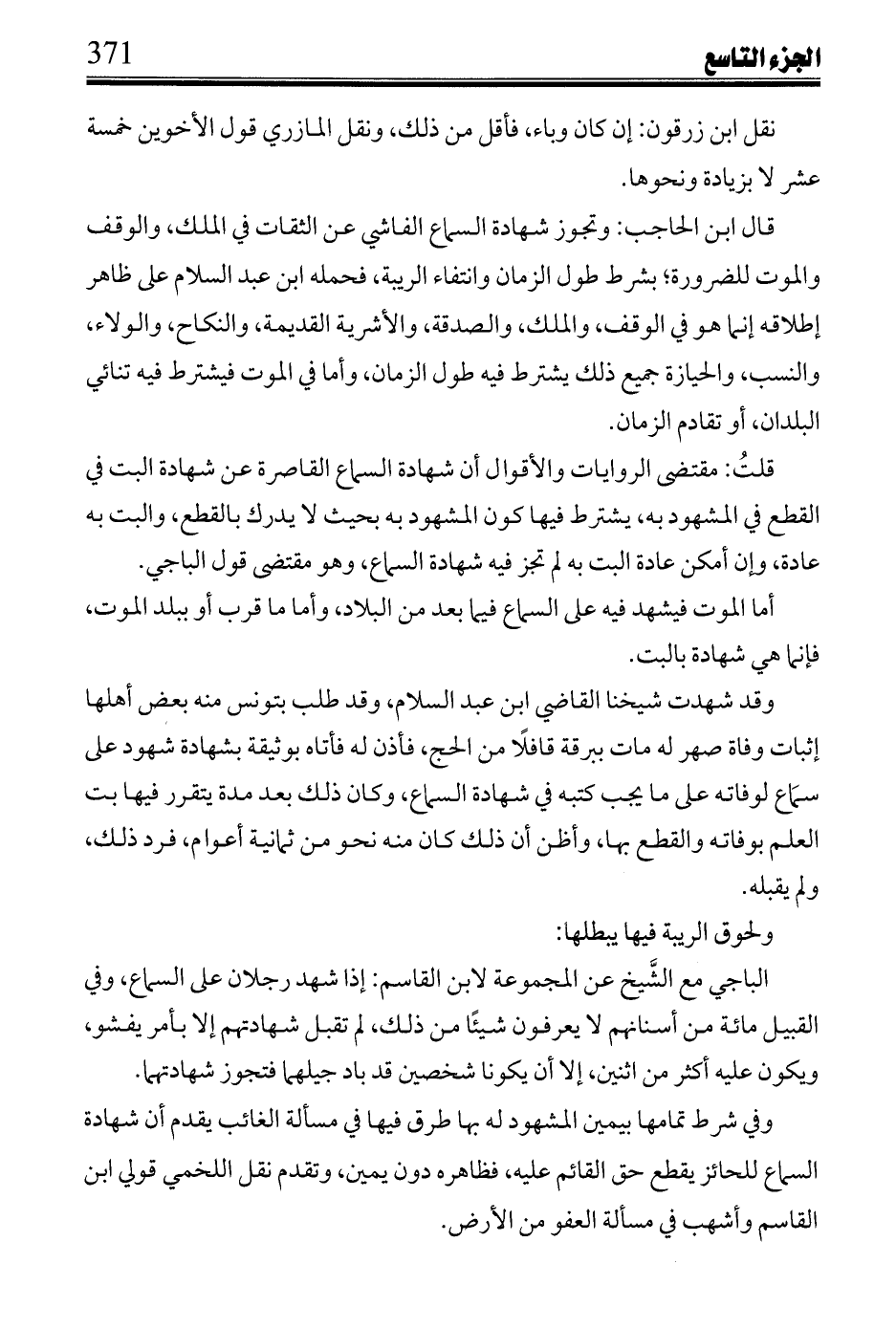 وقد شهدت شيخنا القاضي ابن عبد السلام، وقد طلب بتونس منه بعض أهلها إثبات وفاة صهر له مات ببرقة قافلاً من الحج، فأذن له فأتاه بوثيقة بشهادة شهود على سماع لوفاته على ما يجب كتبه في شهادة السماع، وكان ذلك بعد مدة يتقرر فيها بت العلم بوفاته والقطع بها، وأظن أن ذلك كان منه نحو من ثمانية أعوام، فرد ذلك، ولم يقبله.