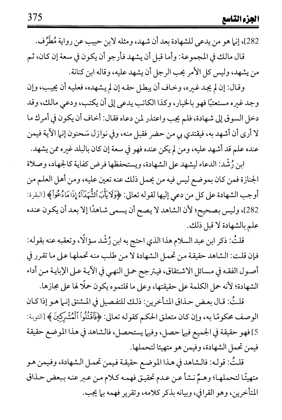 قلت: قوله: فالشاهد في هذا الموضع حقيقة فيمن تحمل الشهادة، وفيمن هو متهيئاً لتحملها؛ وهم مشأ عدم تحقيقه فهمه كلام من عبر عنه ببعض حذاف المتأخرين، وهو القرافي، وبيانه بذكر كلامه، وتقرير فهمه بما يجب.