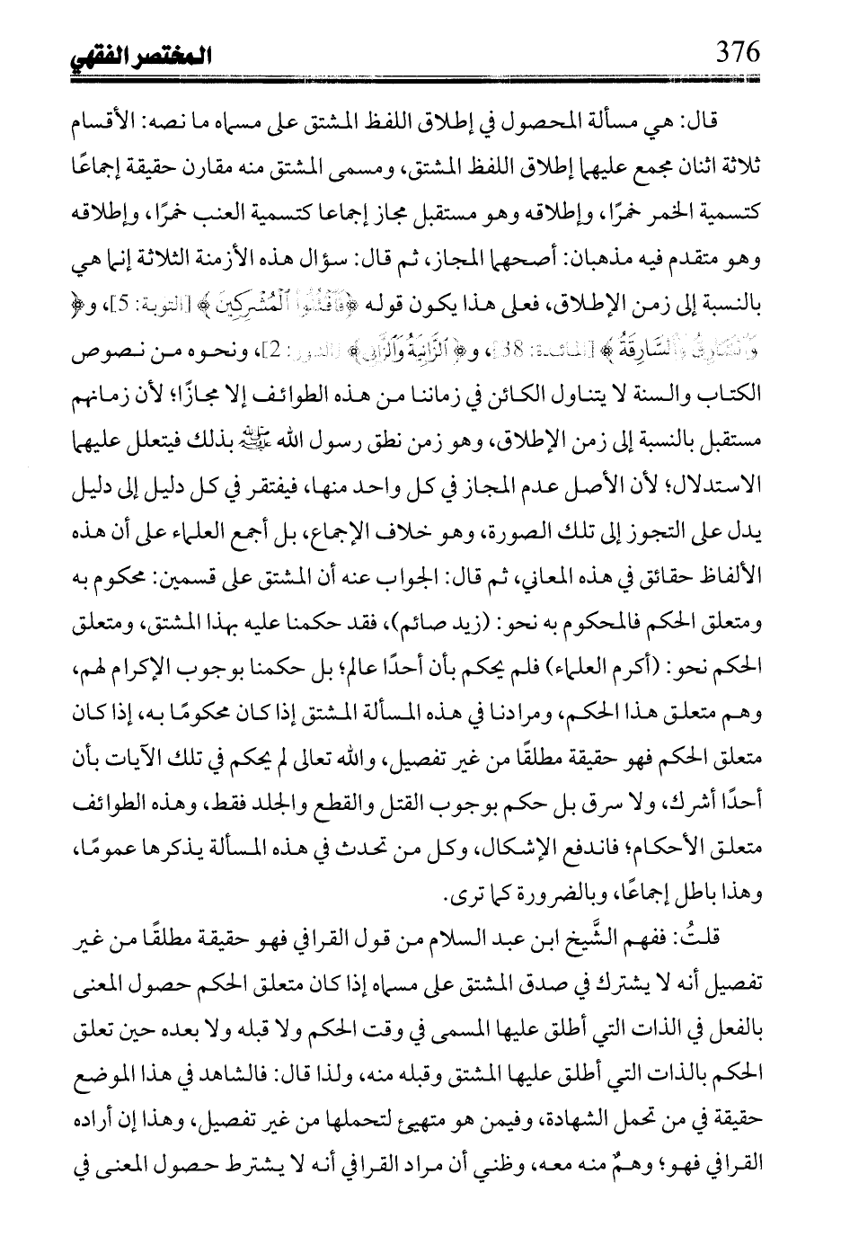 قال: هي مسألة المحصول في إطلاق اللفظ المشتق على مسماه ما نصه: الأقسام ثلاثة اثنان مجمع عليهما إطلاق اللفظ المشتق، ومسمى المشتق منه مقارن حقيقة إجماعاً كتسمية الخمر خمراً، وإطلاقه وهو مستقبل مجاز إجماعا كتسمية العنب خمراً، وإطلاقه وهو متقدم فيه مذهبان: أصحهما المجاز، ثم قال: سؤال هذه الأزمنة الثلاثة إنما هي بالنسبة إلى زمن الإطلاق، فعلى هذا يكون {قوله فَاقْتُلُوا الْمُشْرِكِينَ} [التوبة:5] {وَالسَّارِقُ وَالسَّارِقَةُ} [المائدة:38] {الزَّانِيَةُ وَالزَّانِي} [النور:2] ونحوه من نصوص الكتاب والسنة لا يتناول الكائن في زماننا من هذه الطوائف إلا مجازاً؛ لأن زمانهم مستقبل بالنسبة إلى زمن الإطلاق، وهو زمن نطق رسول الله صلى الله عليه وسلم بذلك فيتعلل عليهما الاستدلال؛ لأن الأصل عدم المجازة في كل واحد منها، فيفتقر في كل دليل إلى دليل يدل على التجوز إلى تلك الصورة، وهو خلاف الإجماع، بل أجمع العلماء على أن هذه الألفاظ حقائق في هذه المعاني، ثم قال: الجواب عنه أن المشتق على قسمين: محكوم به ومتعلق الحكم فالمحكوم به نحو: (زيد صائم)، فقد حكمنا عليه بهذا المشتق، ومتعلق الحكم نحو: (أكرم العلماء) فلم يحكم بأن أحداً عالم؛ بل حكمنا بوجوب الإكرام لهم، وهذا متعلق هذا الحكم، ومرادنا في هذه المسألة المشتق إذا كان محكوماً به، إذا كان متعلق الحكم فهو حقيقة مطلقاً من غير تفصيل، والله تعالى لم يحكم في تلك الآيات بأن أحداً أشرك، ولا سرق بل حكم بوجوب القتل والقطع والجلد فقط، وهذه الطوائف متعلق الأحكام؛ فاندفع الإشكال، وكل من تحدث في هذه المسألة يذكرها عموماً، وهذا باطل إجماعاً، وبالضرورة كما ترى.