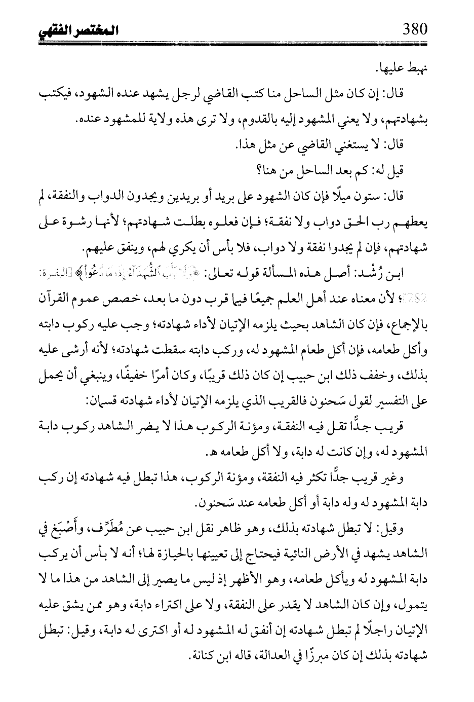 ابن رشد: أصل هذه المسألة قوله تعالى: {وَلا يَابَ الشُّهَدَاءُ إِذَا مَا دُعُوا} [البقرة:282]؛ لأن معناه عند أهل العلم جميعاً فيما قرب دون ما بعد، خصص عموم القرآن بالإجماع، فإن كان الشاهد بحيث يلزمه الإتيان لأداء شهادته؛ وجب علبه ركوب دابته وأكل طعامه، فإن أكل طعام المشهود له، وركب دابته سقطت شهادته؛ لأنه أرشى عليه بذلك، وخفف ذلك ابن حبيب إن كان ذلك قريباً، وكان أمراً خفيفاً، وينبغي أن يحمل على التفسير لقول سَحنون فالقريب الذي يلزمه الإتيان لأداء شهادته قسمان: قريب جداً تقل فيه النفقة ومؤنة الركوب هذا لا يضر الشاهد ركوب دابة المشهود له، وإن كانت له دابة، ولا أكل طعامه.