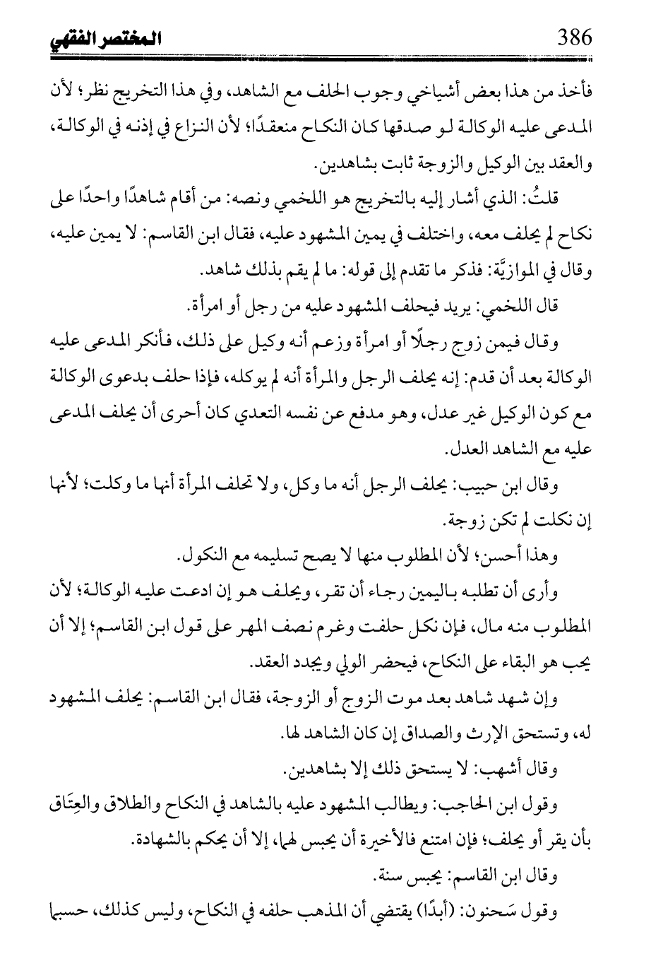 فأخذ من هذا بعض أشياخي وجوب الحلف مع الشاهد، وفي هذا التخريج نظر؛ لأن المدعى عليه الوكالة لو صدقها كان النكاح منعقداً؛ لأن النزاع في إذنه في الوكالة، والعقد بين الوكيل والزوجة ثابت بشاهدين.