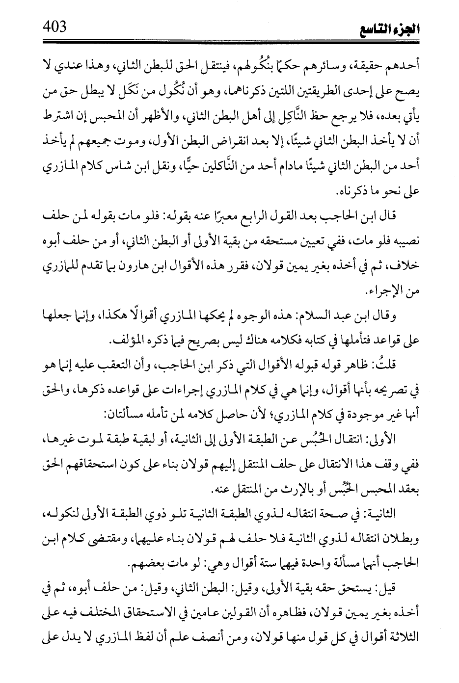 أحدهم حقيقة، وسائرهم حكما بنكولهم، فينتقل الحق للبطن الثاني، وهذا عندي لا يصح على إحدى الطريقتين اللتين ذكرناهما، وهو أن نكول من نكل لا يبطل حق من يأتي بعده، فلا يرجع حظ الناكل إلى أهل البطن الثاني، والأظهر أن المحبس إن اشترط أن لا يأخذ البطن الثاني شيئاً، إلا بعد انقراض البطن الأول، وموت جميعهم لم يأخذ أحد من البطن الثاني شيئاً مادام أحد من الناكلين حيا، ونقل ابن شاس كلام المازري على نحو ما ذكرناه.