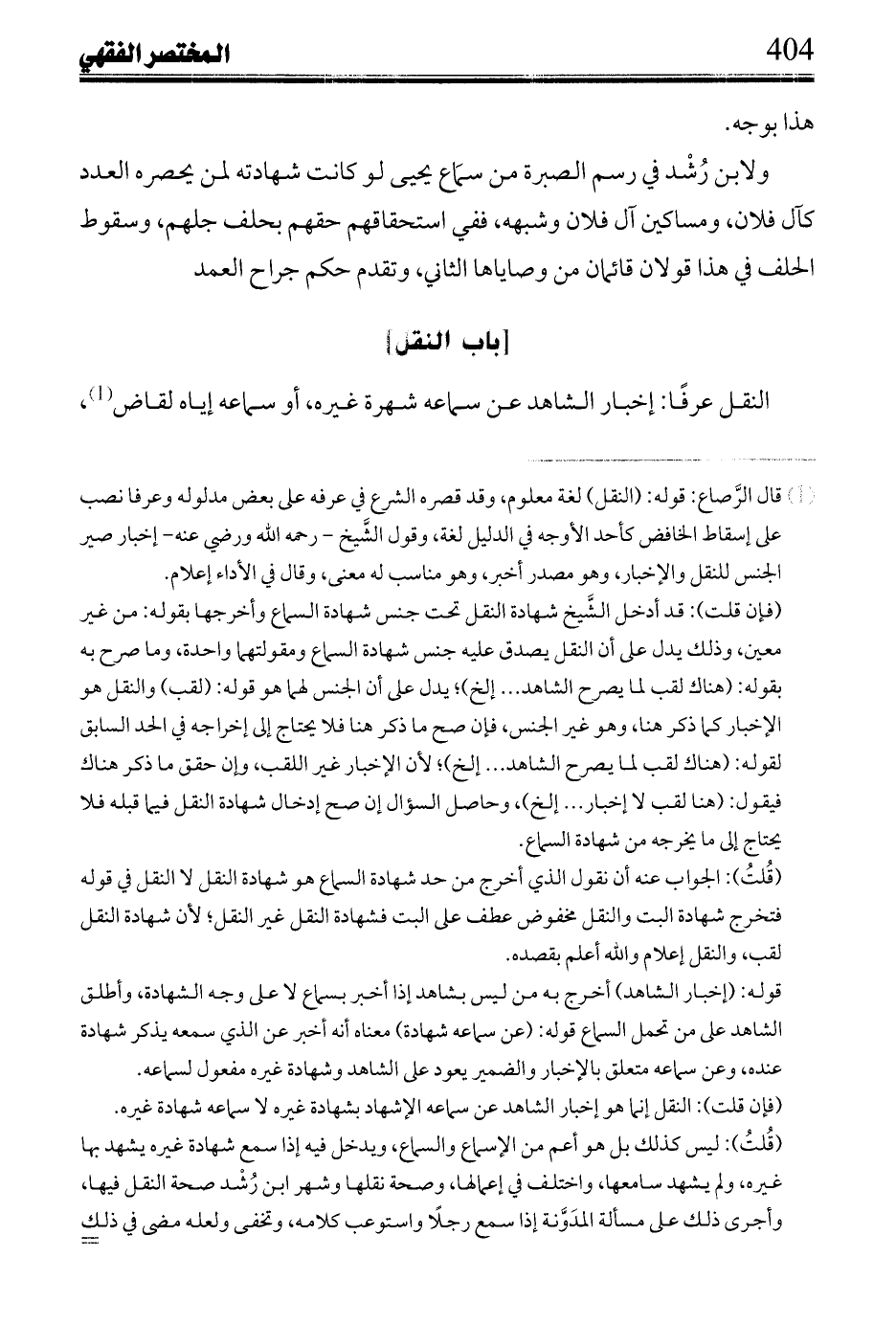 ولابن رشد في رسم الصبرة من سماع يحيى لو كانت شهادته لمن يحصره العدد كآل فلان، ومساكين آل فلان وشبهه، ففي استحقاقهم حقهم بحلف جلهم، وسقوط الحلف في هذا قولان قائمان من وصاياها الثاني، وتقدم حكم جراح العمد.