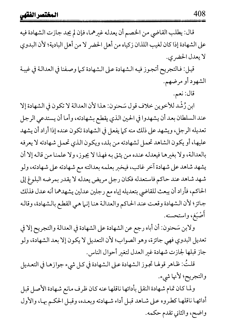 ولابن سحنون: أن أباه رجع عن الشهادة على الشهادة في العدالة والتجريح إلا في تعديل البدوي فهي جائزة، وهو الصواب؛ لأن التعديل لا يكون إلا بعد الشهادة، ولو جاز قبلها لجازت شهادة غير العدل لتغير أحوال الناس.