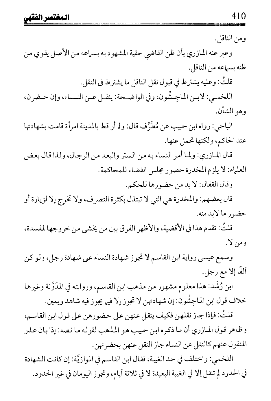قلت: فإذا جاز نقلهن فكيف ينقل عنهن على حضورهن على قول ابن القاسم، وظاهر قول المازري أن ما ذكره ابن حبيب هو المذهب لقوله ما نصه: إذا بان عذر المنقول عنهم كالنقل عن النساء جاز النقل عنهن بحضرتهن.