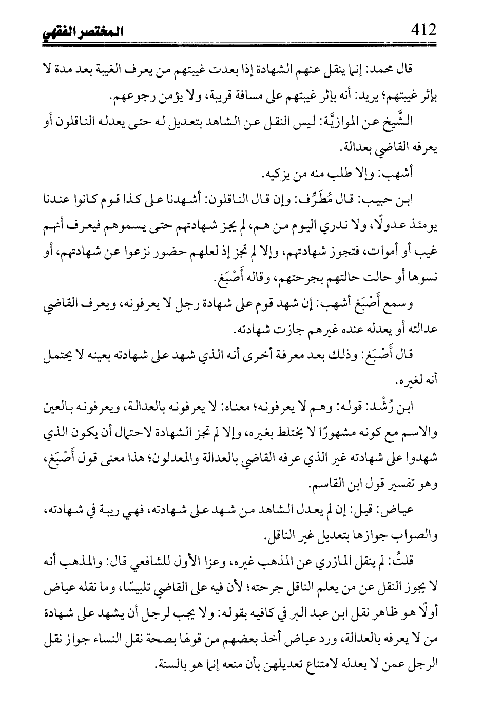 الشيخ عن الموازية: ليس النقل عن الشاهد بتعديل له حتى يعدله الناقلون أو يعرفه القاضي بعدالة.