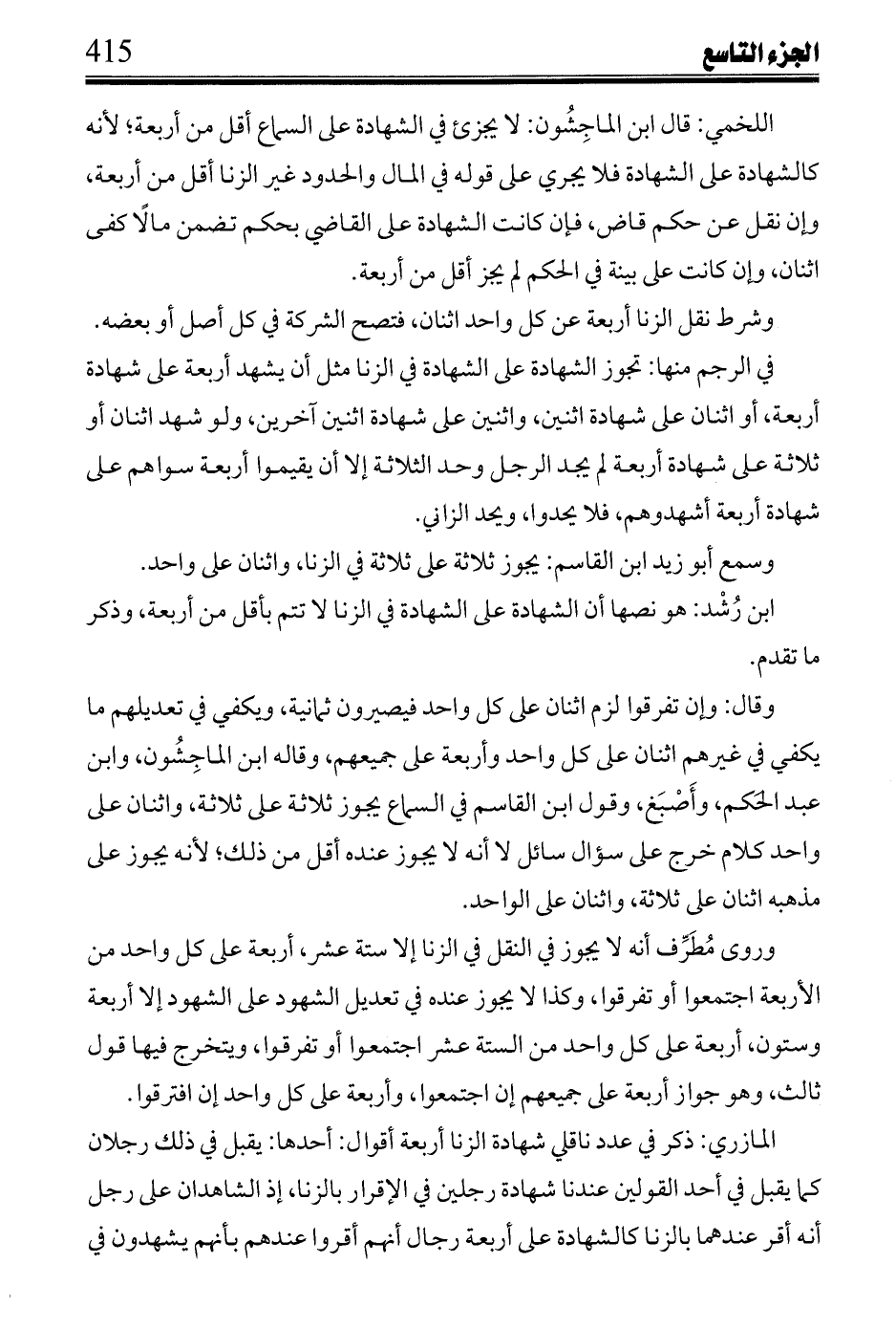 المازري: ذكر في عدد ناقلي شهادة الزنا أربعة أقوال: أحدها: يقبل في ذلك رجلان كما يقبل في أحد القولين عندنا شهادة رجلين في الإقرار بالزنا، إذ الشاهدان على رجل أنه أقر عندهما بالزنا كالشهادة على أربعة رجال أنهم أقروا عندهم بأنهم يشهدون في