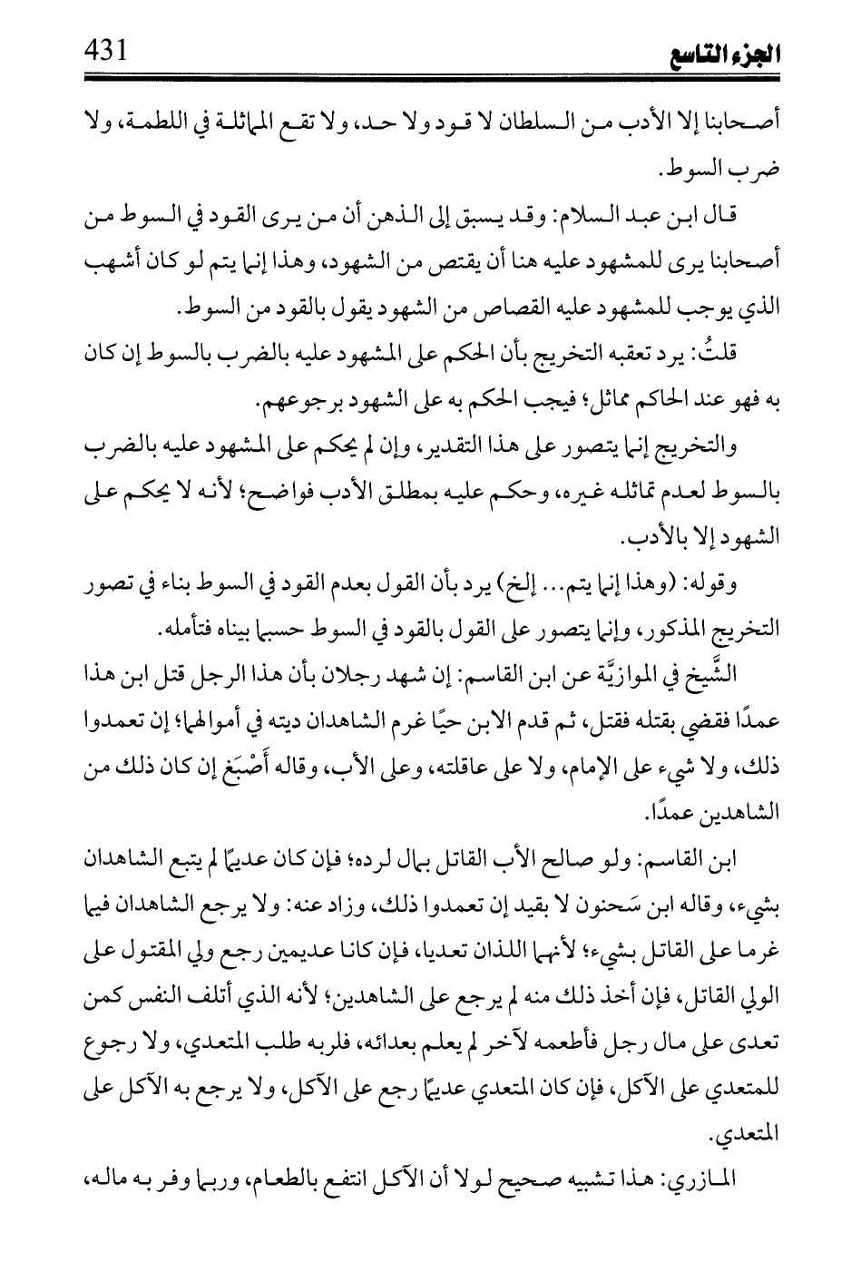 قال ابن عبد السلام: وقد يسبق إلى الذهن أن من يرى القود في السوط من أصحابنا يرى للمشهود عليه هنا أن يقتص من الشهد، وهذا إنما يتم لو كان أشهب الذي يوجب للمشهود عليه القصاص من الشهود يقول بالقود من السوط.